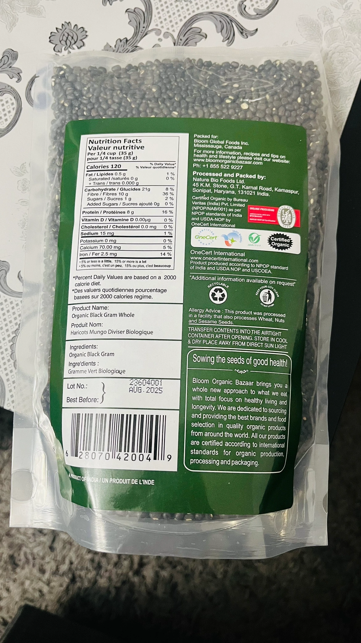Organic whole black gram from Bloom Organic Bazaar. Net weight: 2 lbs, 908 g.