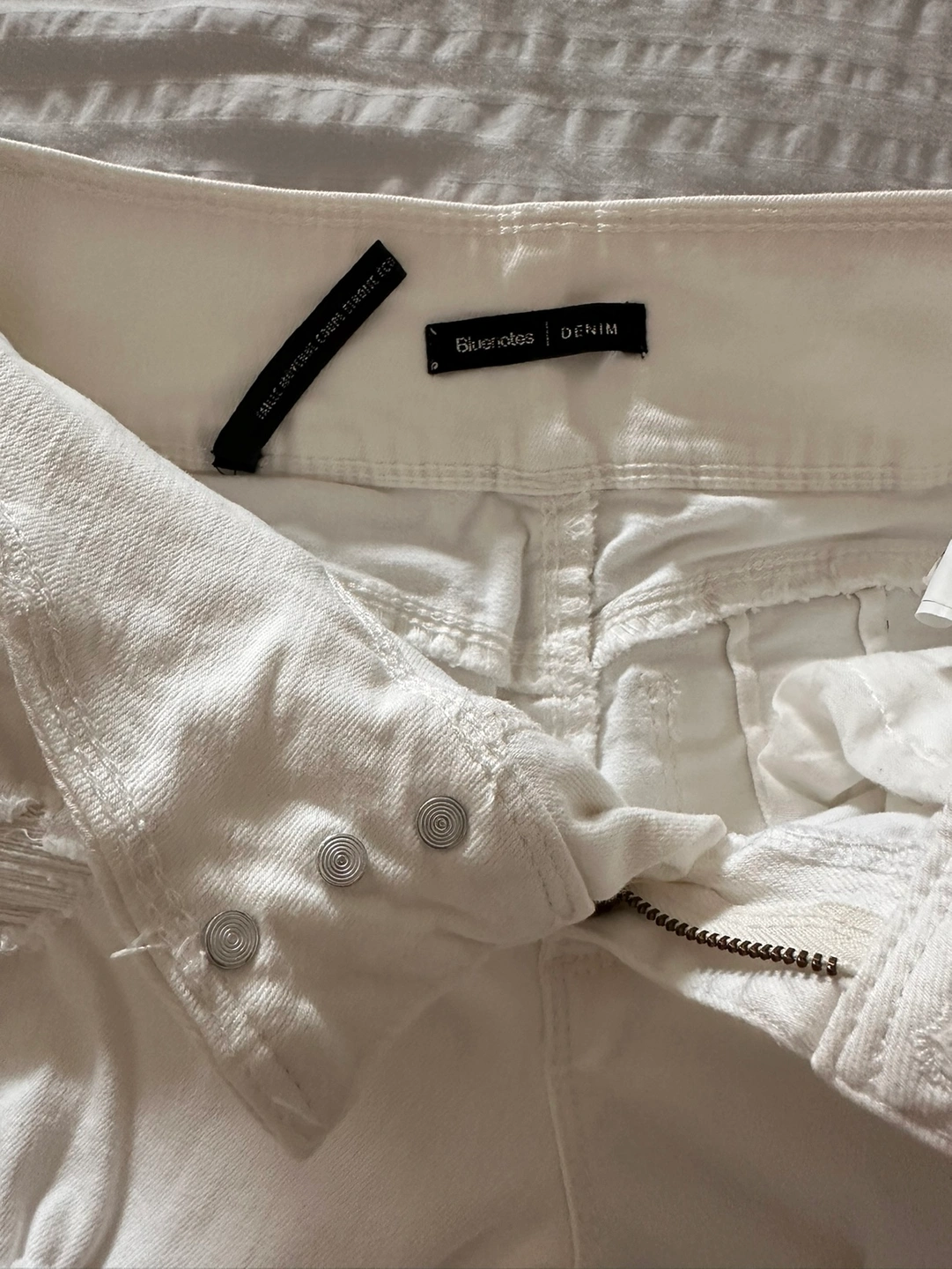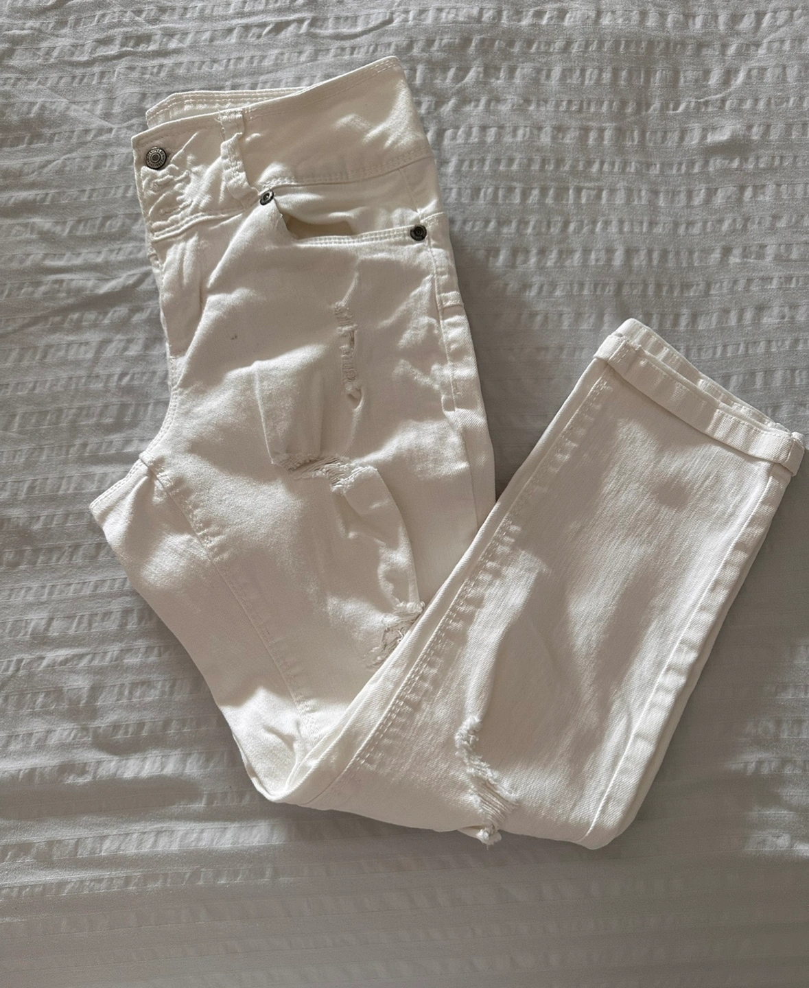 530Mid rise crop skinny white denim jeans. Ripped hem, zipper and bottom closure. Cropped jeans