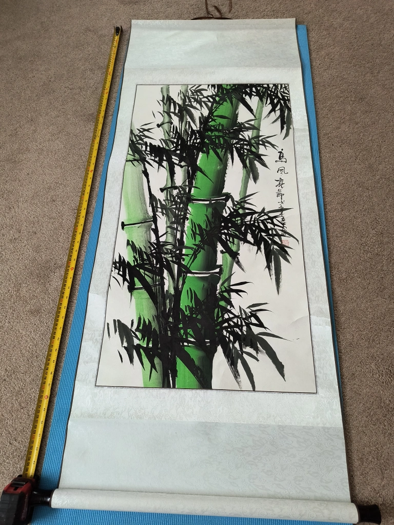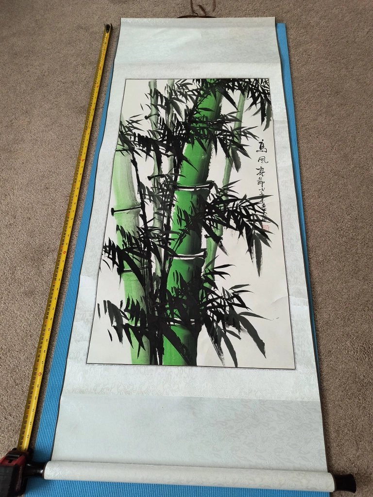 Hand-painted scroll of bamboo on rice paper. It is in a traditional scroll format with a silk hanging cord at the top. The scroll is approximately 67" long and 22" wide. It is in very good condition. It comes with a light, felt-like mat to keep it flat and protected. It would look great in any home, office, or studio!