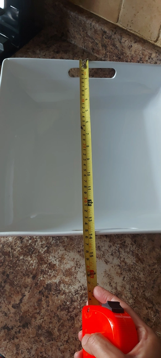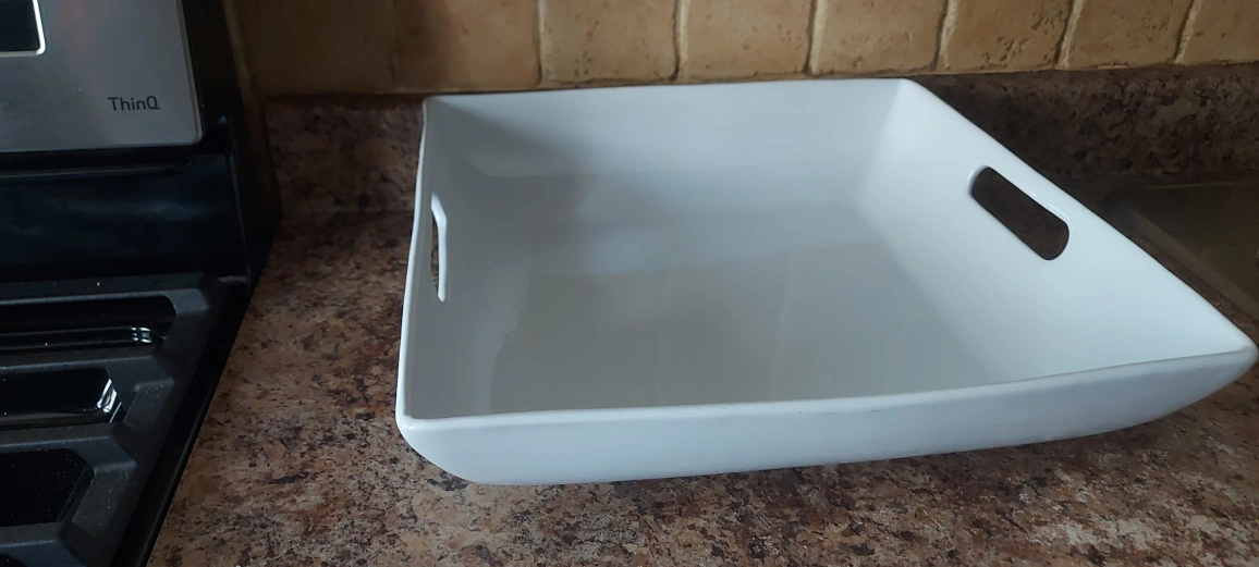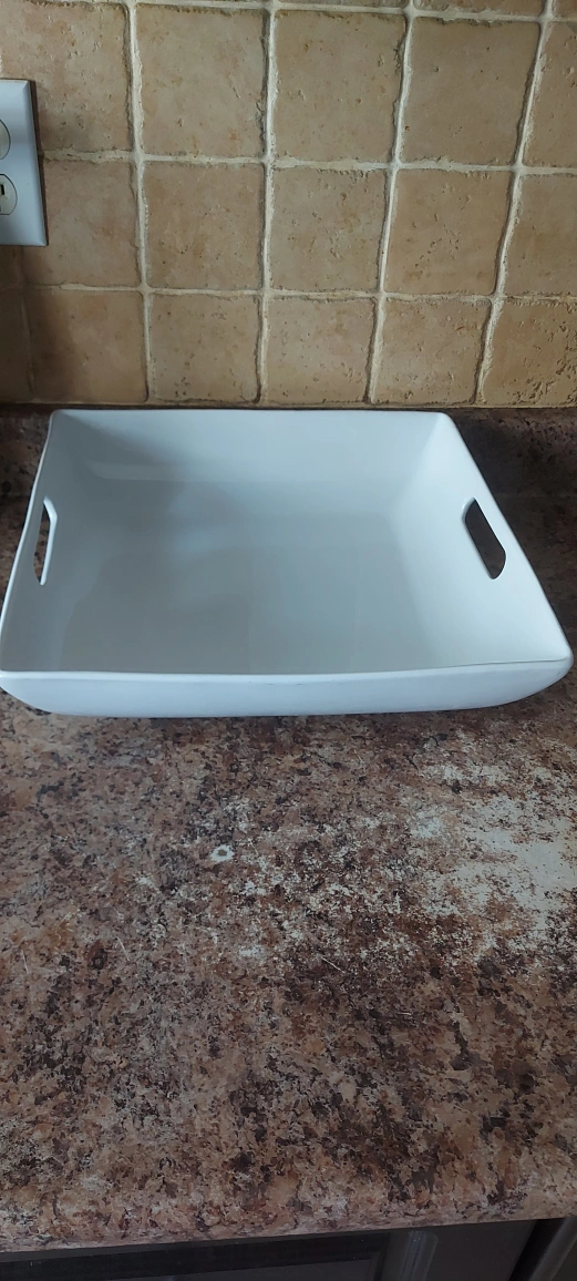 White serving tray with two handles. Great for serving snacks, appetizers, or use as a decorative tray on a table. Measures approximately 15 inches across.