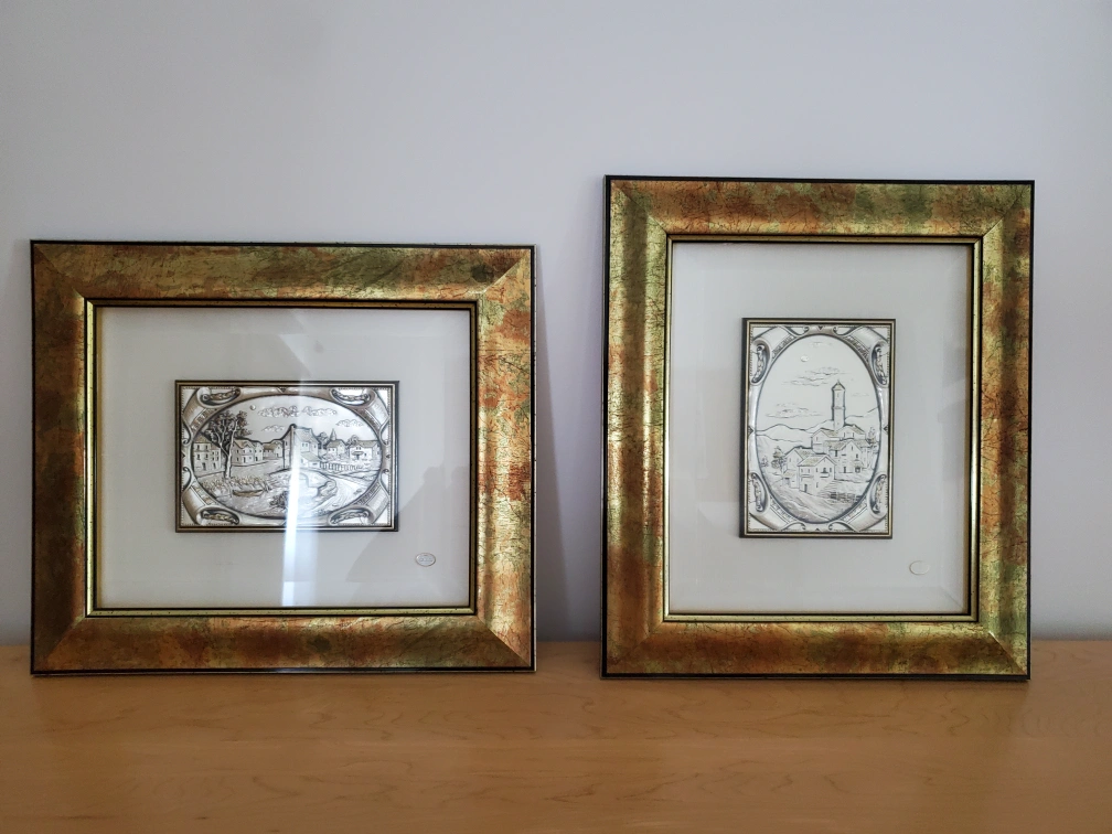 Set of two silver relief art pieces in gold frames, with a village scene. Sold as a pair for $40 or $25 each.