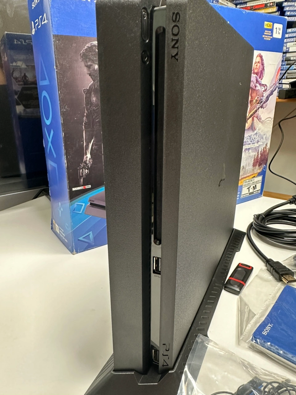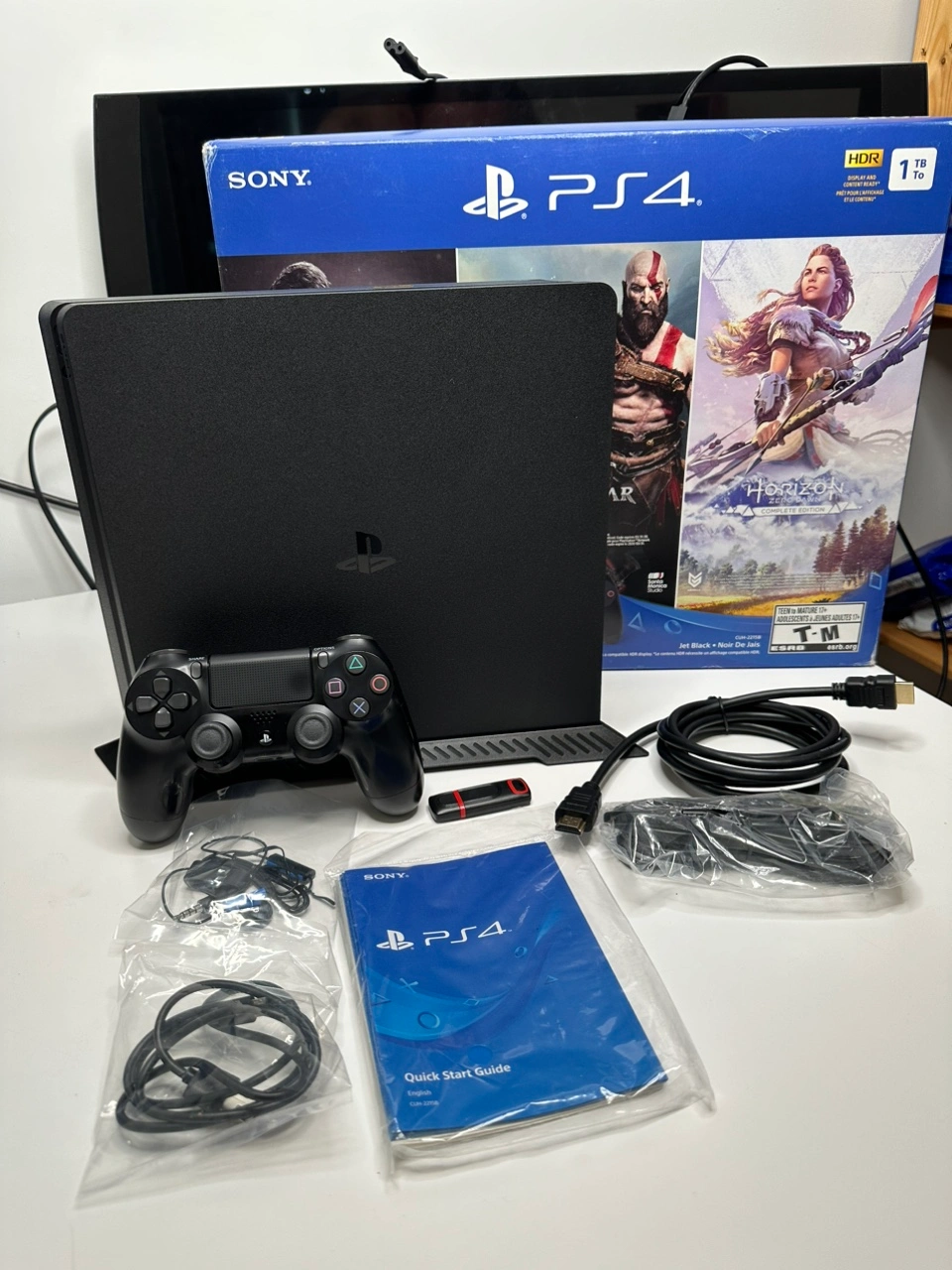 90PS4 Slim 1Tb - new condition. Firmware 9.0 Comes with everything you need to play. All bags and papers included. Possible to pick up in Thornhill area by agreement