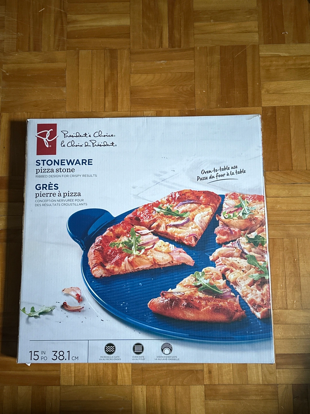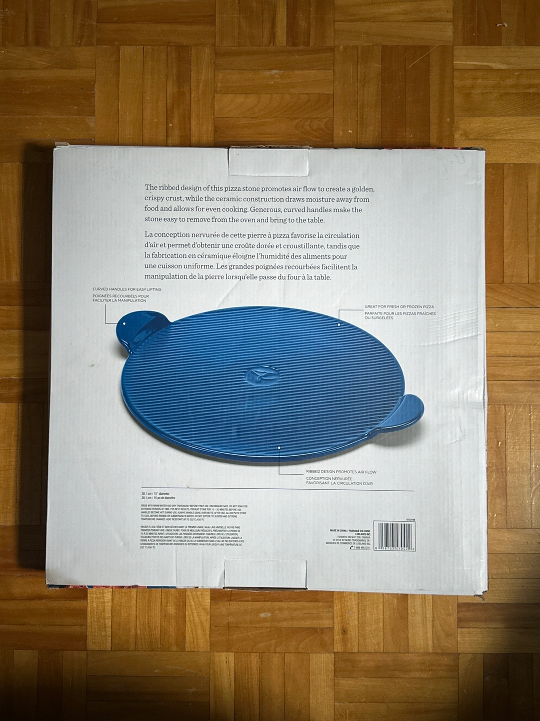 5715-inch pizza stone in blue. The stone has curved handles for easy lifting. Oven and dishwasher safe. Great for fresh or frozen pizza. USED ONCE. Don’t have the kitchen space for it.