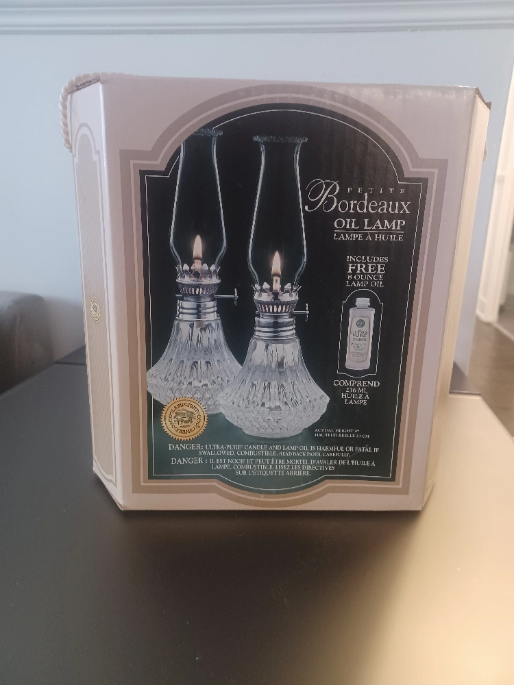 Set of 2 petite oil lamps in a box with a free 8-ounce bottle of oil. Each lamp is approximately 9" tall.