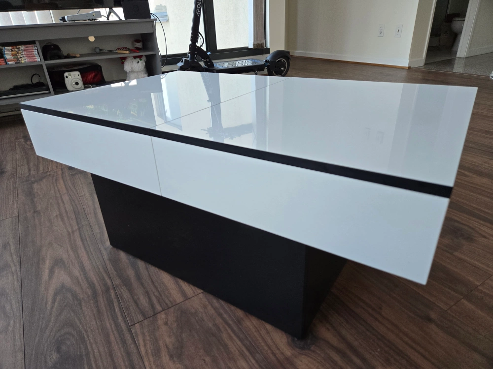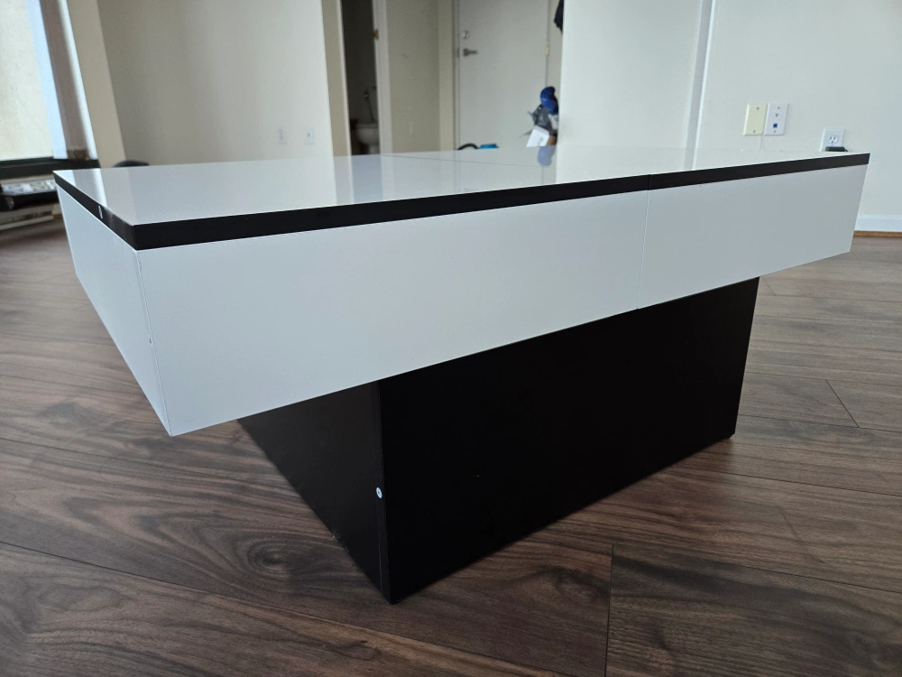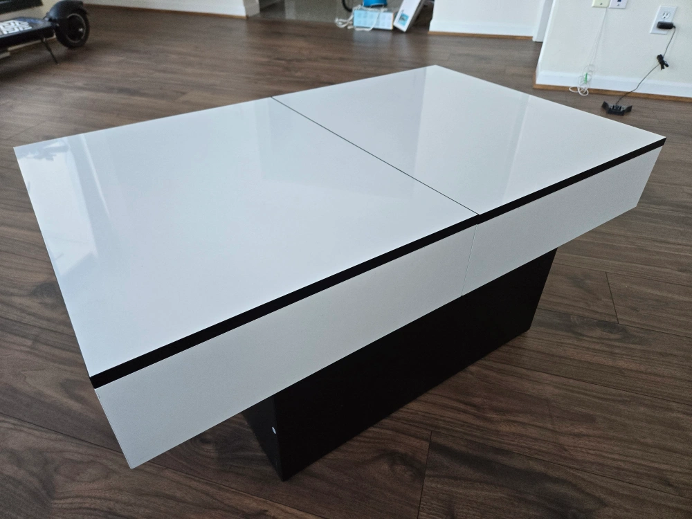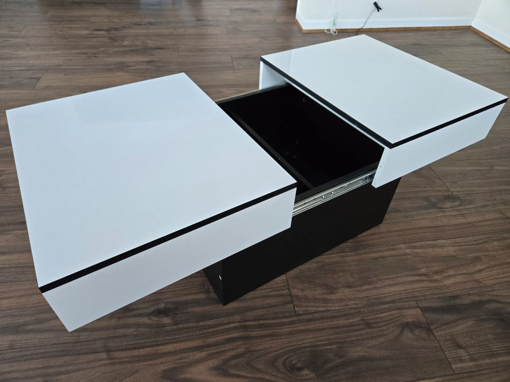 A modern, stylish coffee table that features a slide top with storage space. The table is made from high-quality materials and has a sleek, minimalist design. The table has a white top and a black base, making it a versatile piece that will complement a variety of decor styles. It would make a great addition to any living room or entertainment area.