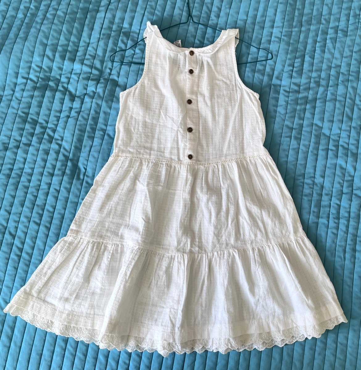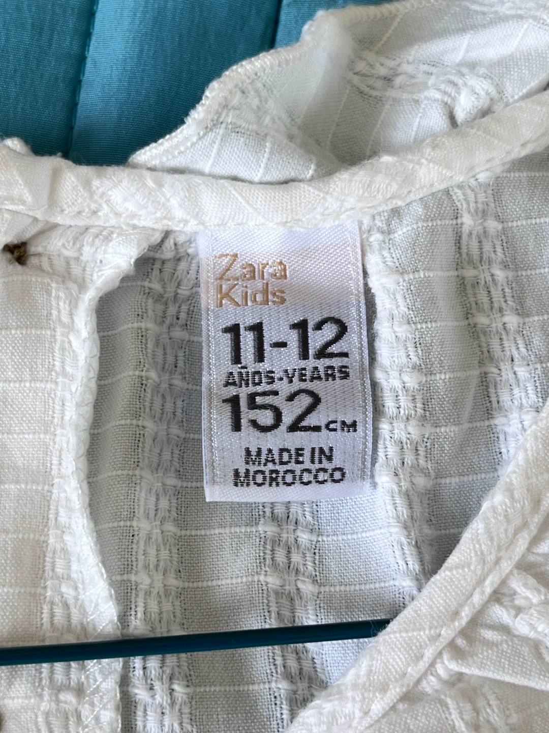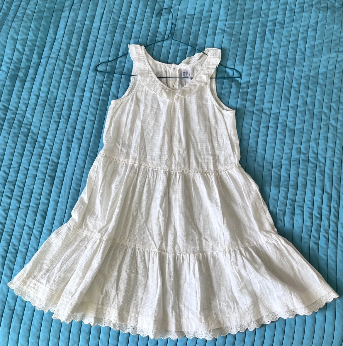 $5 for a kids’ white sleeveless dress with a lace trim. The dress has a button up front. It is for height 152cm/4’11”. Made in Morocco.