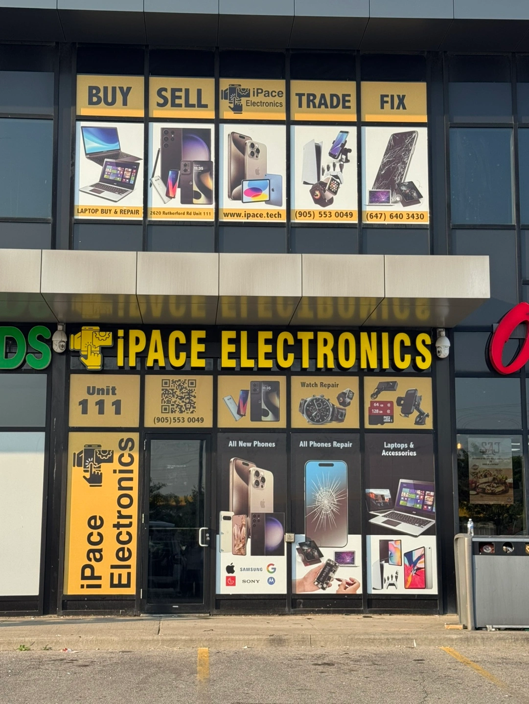 The sign for iPace Electronics, a shop that buys, sells, trades, and fixes electronics. The sign is composed of eight sections with a variety of images and text. The sign is mounted on the outside of a brick building.