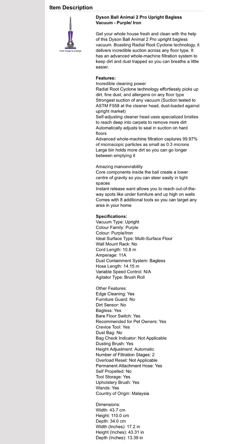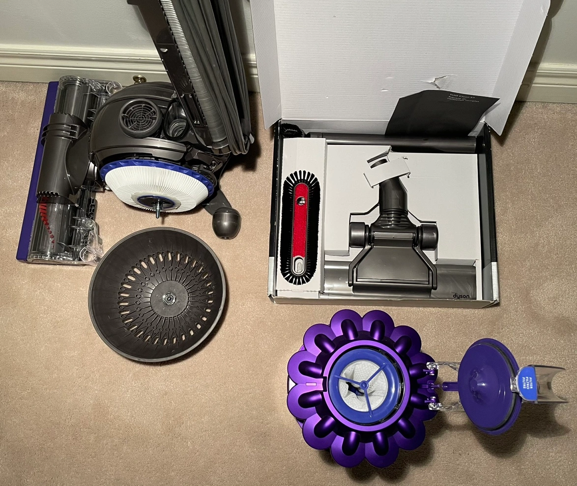 65NEW Store Display! MSRP $699.99 + tax PRICE FIRM or FIRST COME! Items Included: Dyson Ball Animal 2 Pro Vacuum Dyson Total Clean Kit Hard Floor Tool Soft Dusting Brush Combination Crevice Tool Items Not Included: Stair Tool Combination Tool Stubborn Dirt Brush Tangle-free Turbine Tool Carbon Fibre Soft Dusting Brush Groom Tool Reach Under Tool Warranty: Unregistered Unit has been tested and is fully functional. Complimentary Dyson Total Clean Kit has been added to cover missing accessories. Minor scuffs from customer contact. Rubber seal for canister has a minor deformation, but it does not impact functionality. Brand new Filters included with unit. OEM box not included. Pay via Cash, Credit, e-transfer, crypto, Apple Pay, & MORE! **Delivery and Shipping is possible depending on location and small fee. Delivery and shipping fees must be paid in advance by you regardless of purchase** https://www.dysoncanada.ca/en/vacuum-cleaners/uprights/ball-animal-2 Caveat emptor It is the duty of the buyer to inspect, test, and agree to our products prior to completing transaction. You accept full responsibility of the product the second money exchanges hands even if you choose to not test and inspect. If the unit is factory sealed and you decide to break the seal to inspect and test, you agree to complete the sale as long as the product inside is in adequate condition.