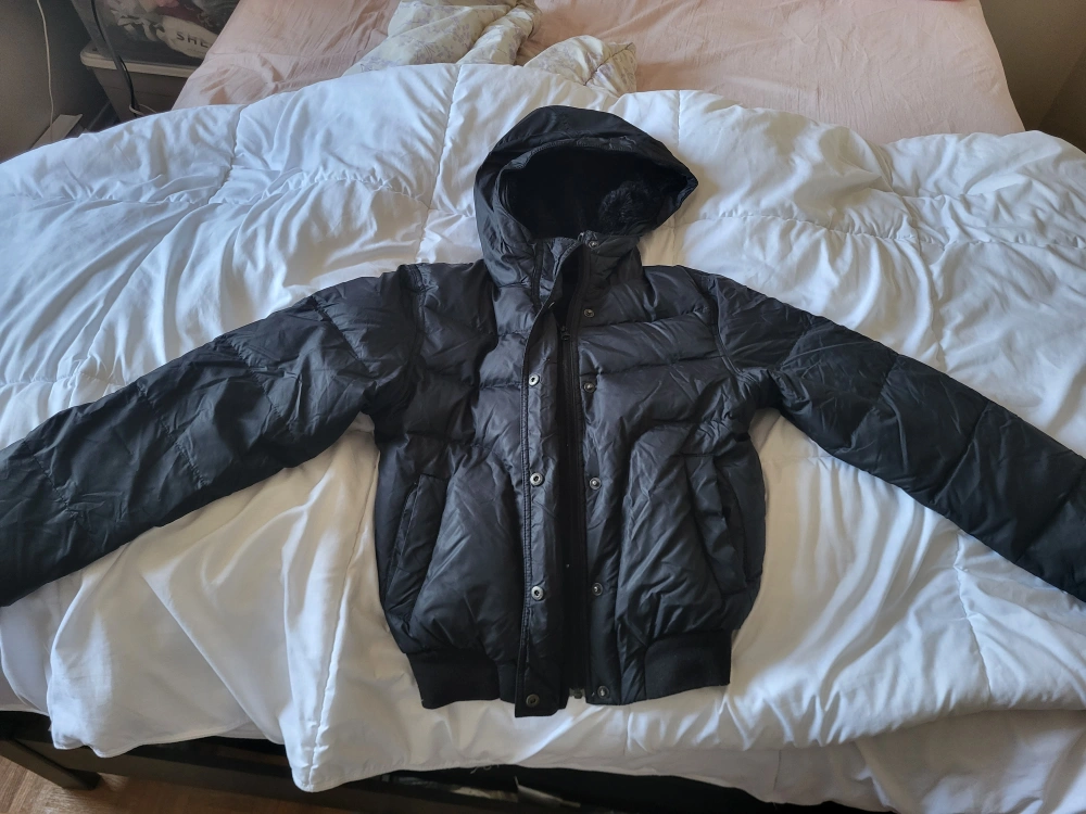 A black puffer jacket with a faux fur lined hood. It has a zipper and snap closure and two pockets.