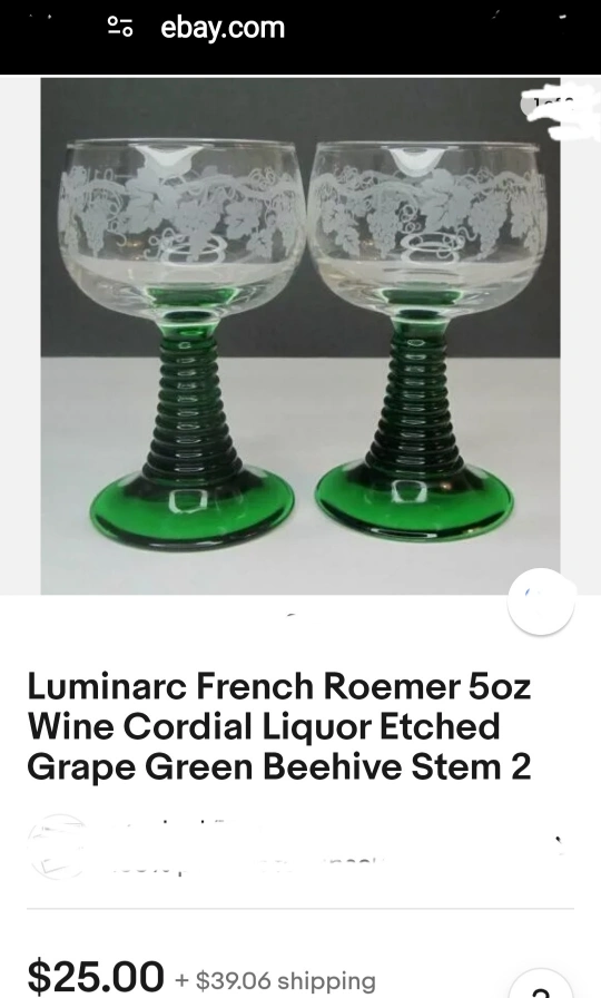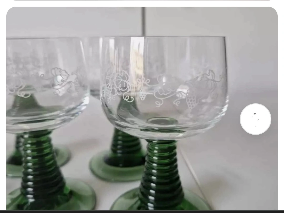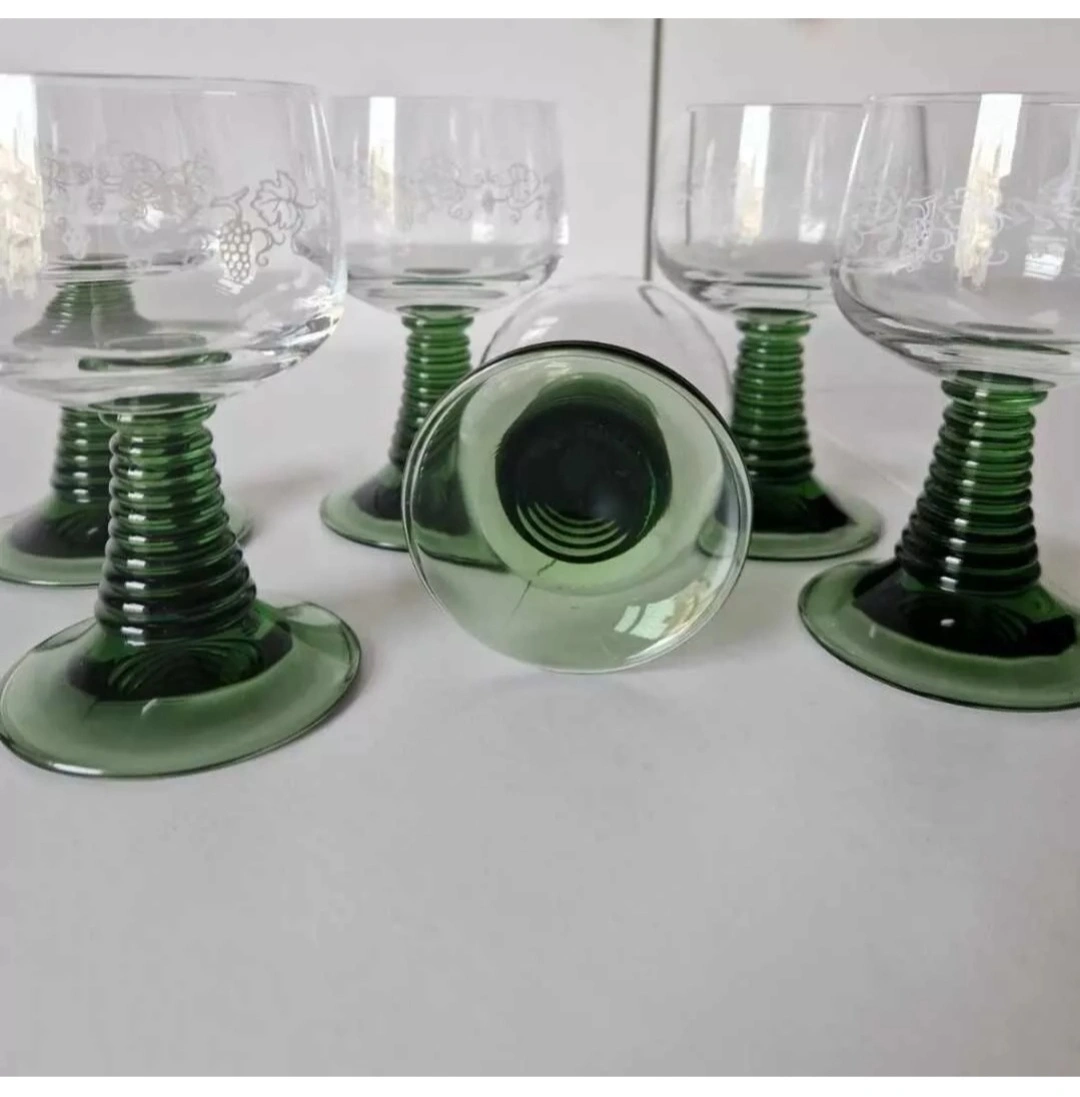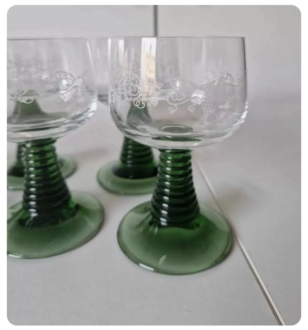 Small green round glasses with beautiful etching. Beautiful pattern.
