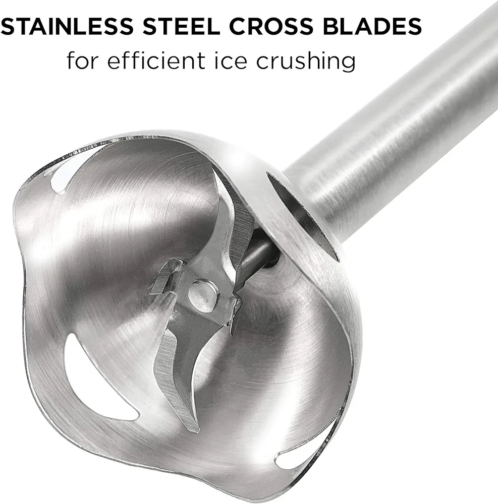 This immersion blender has stainless steel accents and an ergonomic grip with 2-speed control. It features a soft-touch matte finish and stainless steel cross blades for efficient ice crushing. Make smoothies at the push of a button!