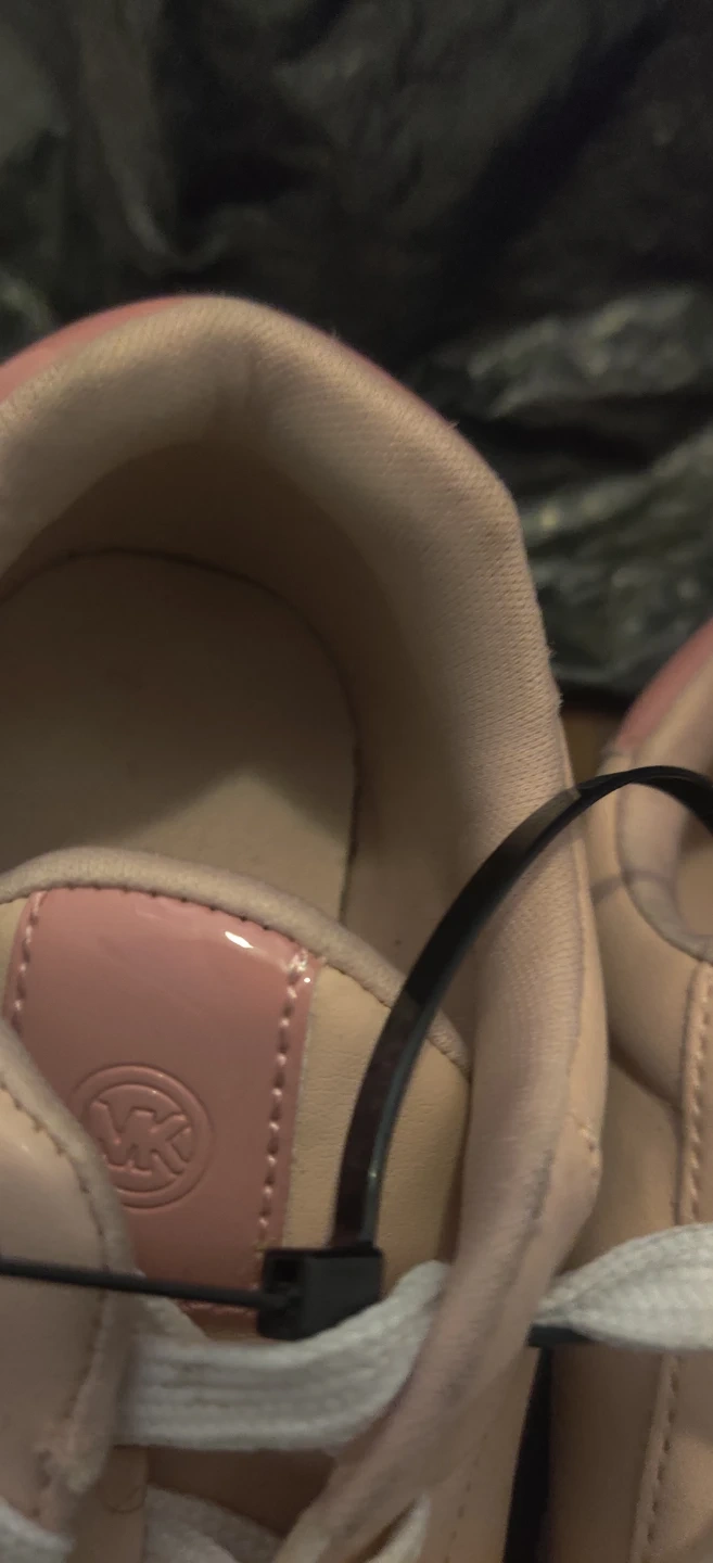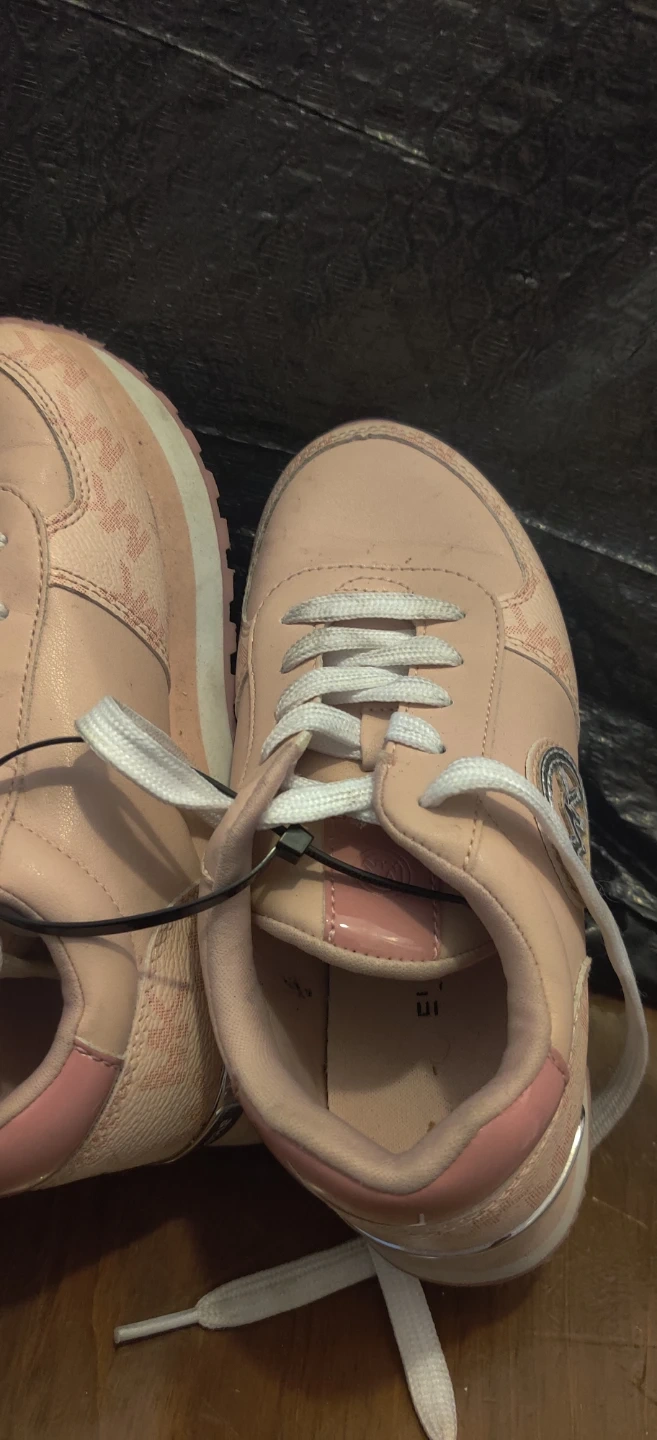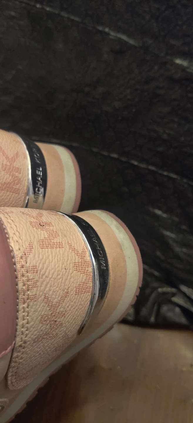 These are pink Michael Kors sneakers with the MK logo pattern. They have a synthetic upper and TPR sole. These shoes are size 2 youth.needs minor cleaning and the brands name on the inside has mostly come off from getting washed