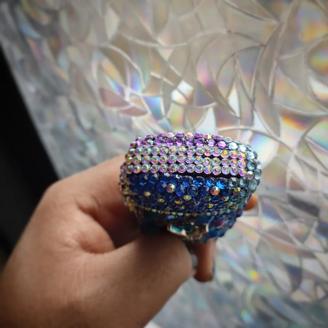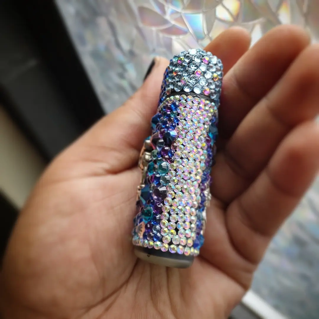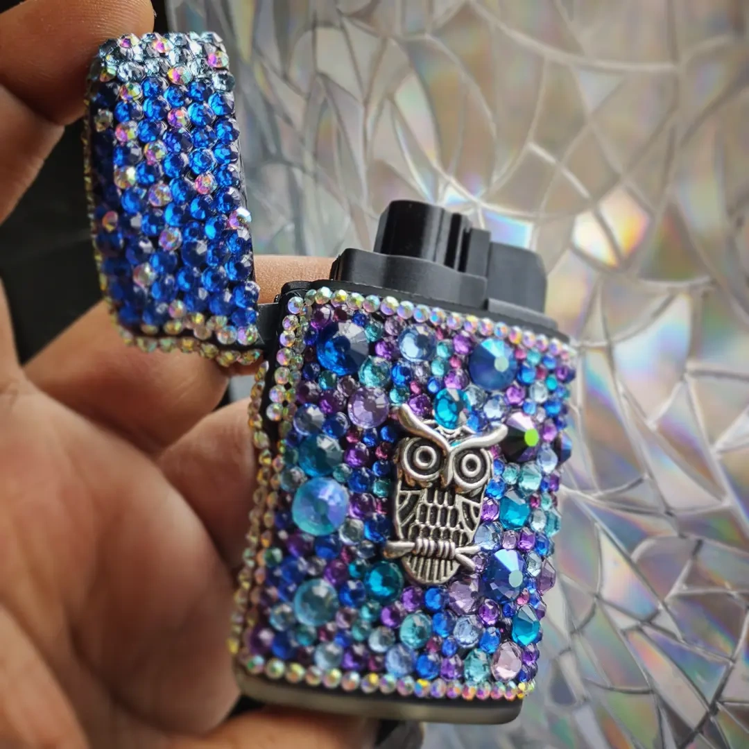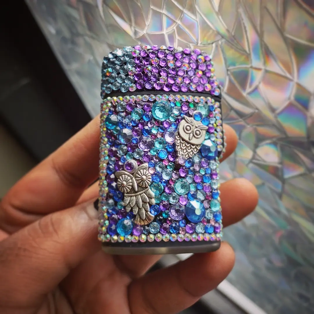 Light and smoke in style with this glam luxury Lighter. This handmade beauty is covered in Bling! Blue and purple Rhinestones with Tibetan silver owl accents This Torch is refillable and Windproof! Pick up is in the Upper West Side Area