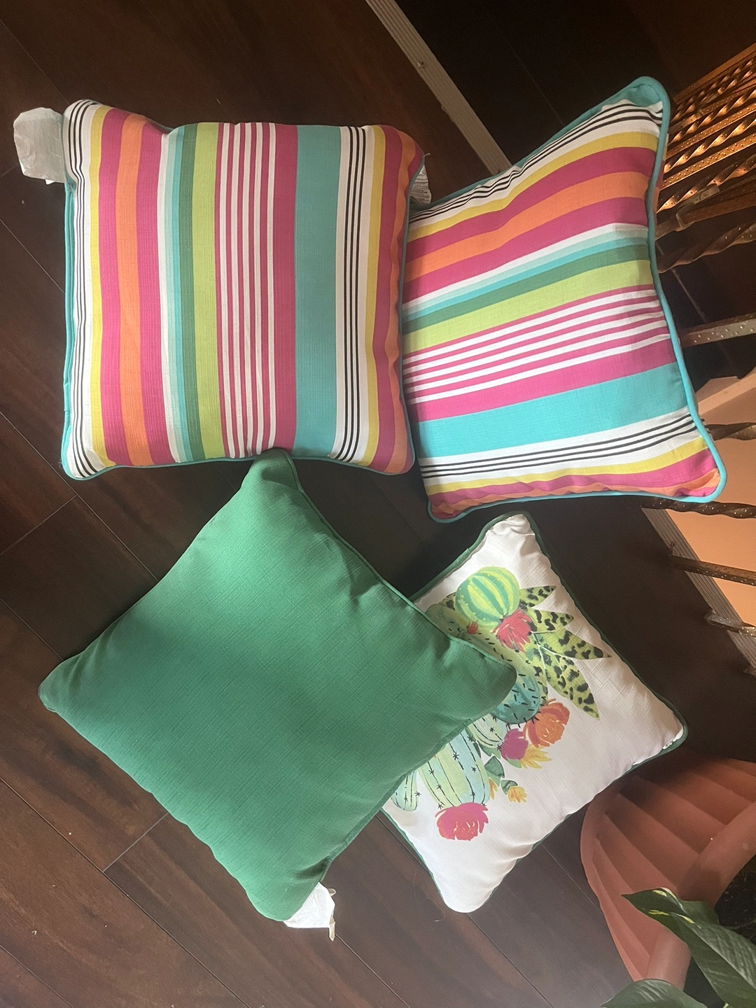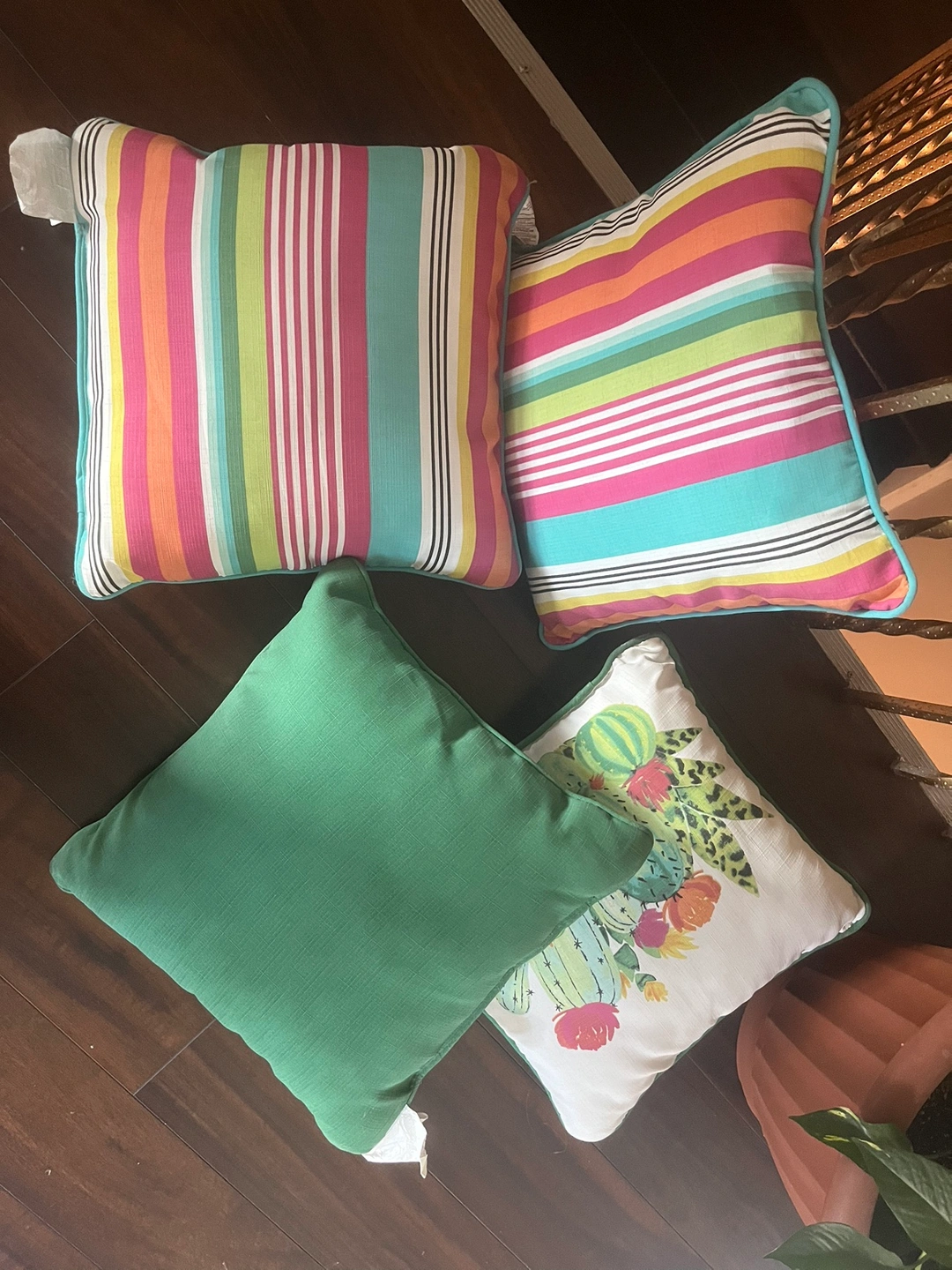 Four throw pillows in various colours and patterns for outdoor. $10 each