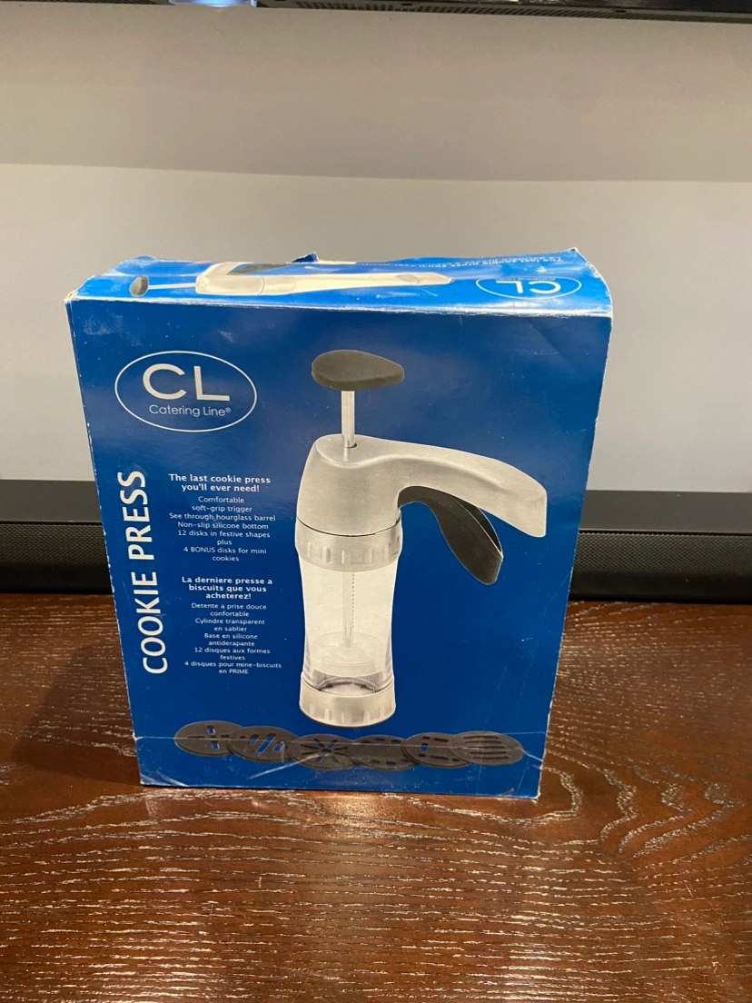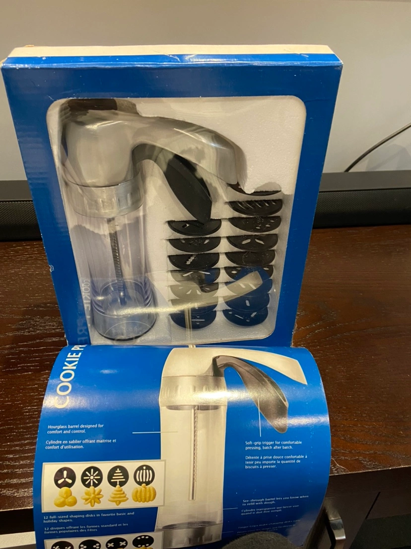 This is a cookie press with a variety of interchangeable tips for creating different shapes and designs for cookies. Never used.