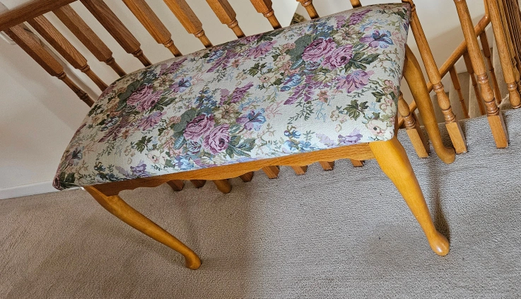 A bench with a floral upholstered seat and wooden legs. Very comfortable for tall people.