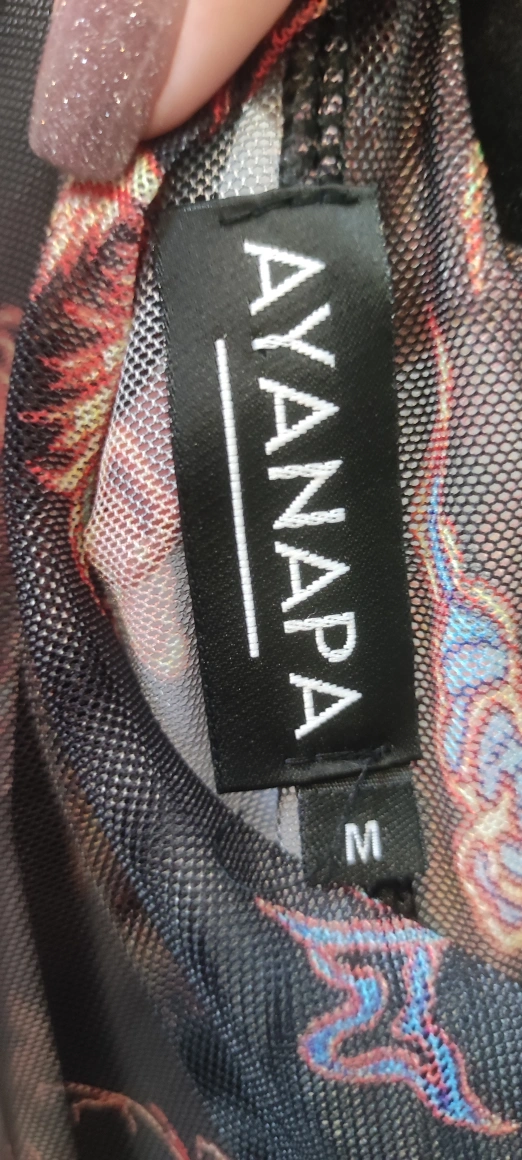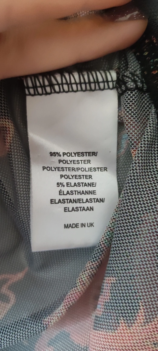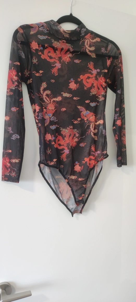 Black mesh bodysuit with a dragon design. Long sleeves and a mock neck. Snap closure at the crotch. Made in the UK.