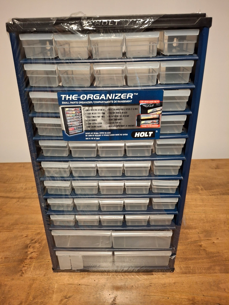 This is a Holt The Organizer Small Parts Organizer with many clear drawers.