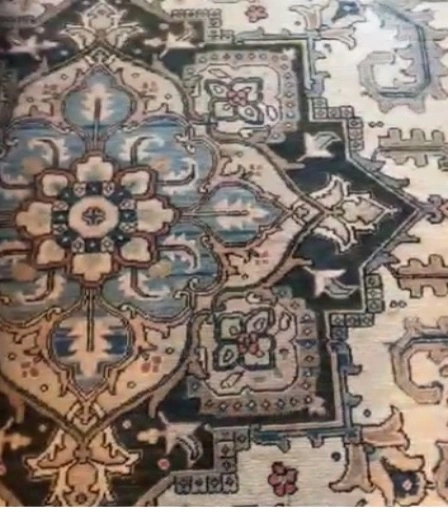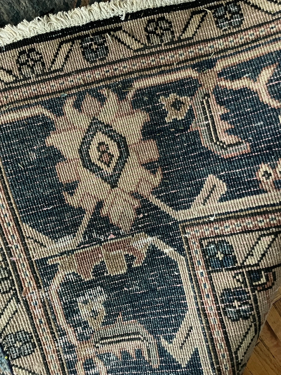 I have owned this rug for seven years. It’s a vintage Persian rug featuring a center medallion pattern in light and dark blue and rose on a cream background. The rug will be professionally cleaned upon purchase. In person pick up preferred, delivery a possibility.