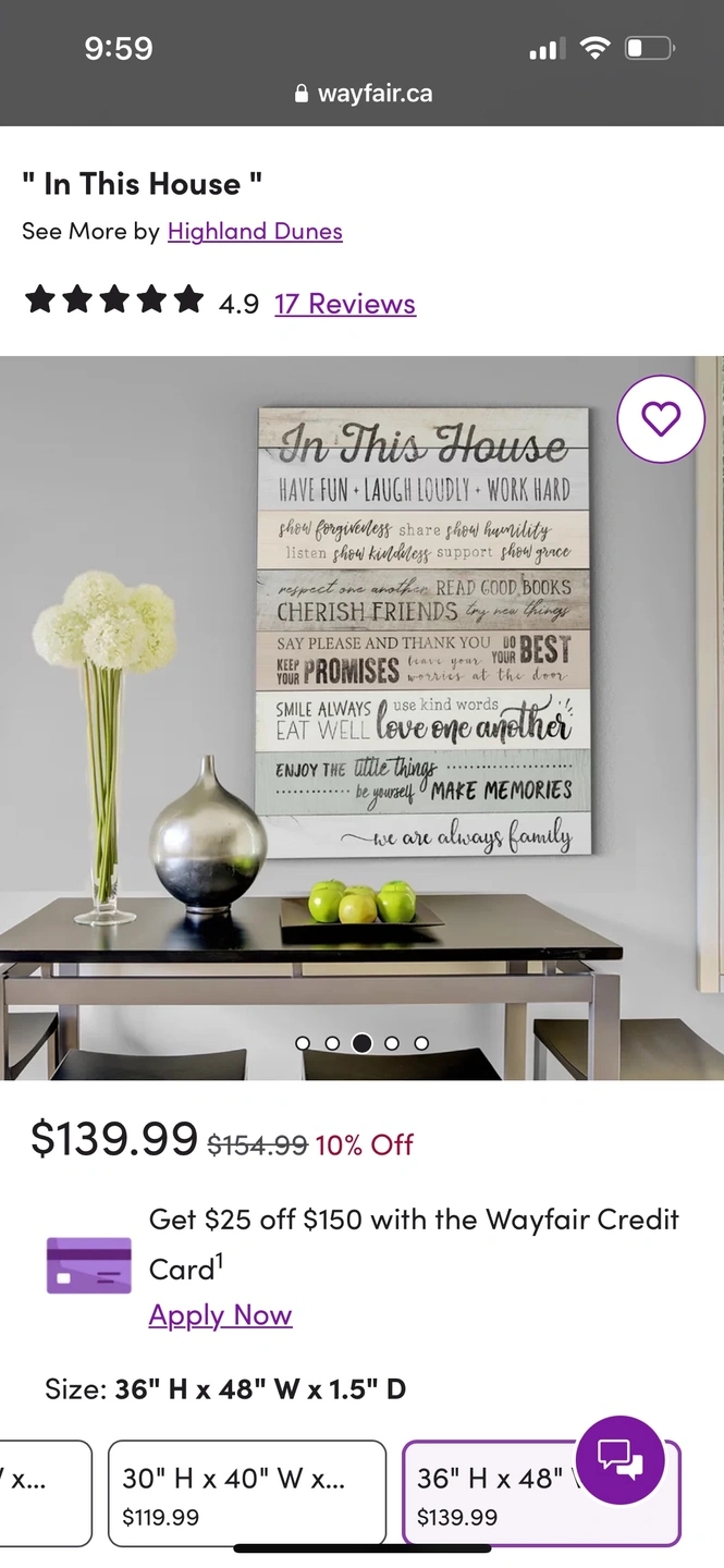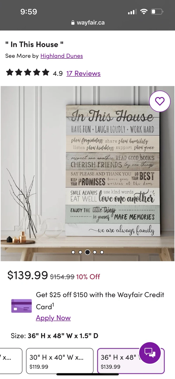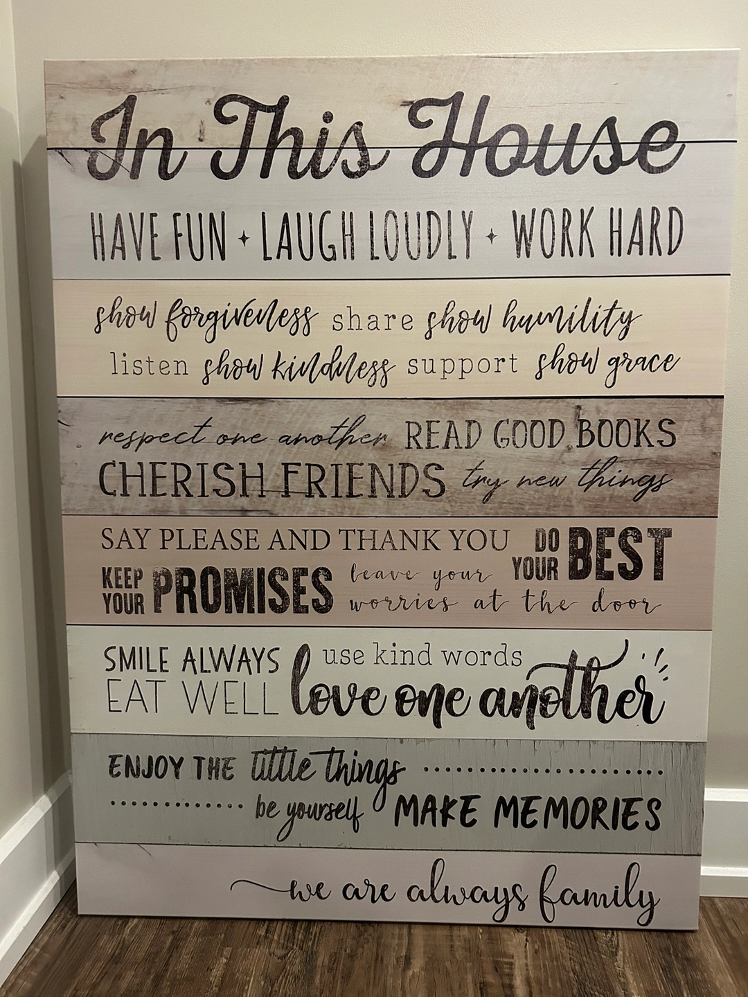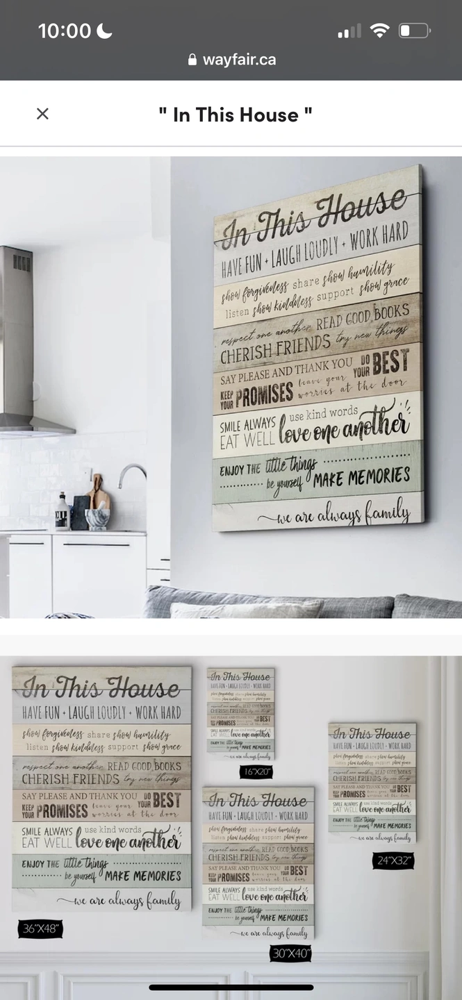 Giant house rules wall decor. Excellent condition. Perfect for cottage. https://www.wayfair.ca/decor-pillows/pdp/highland-dunes-in-this-house-textual-art-on-wrapped-canvas-xtbe1404.html?piid=29146562