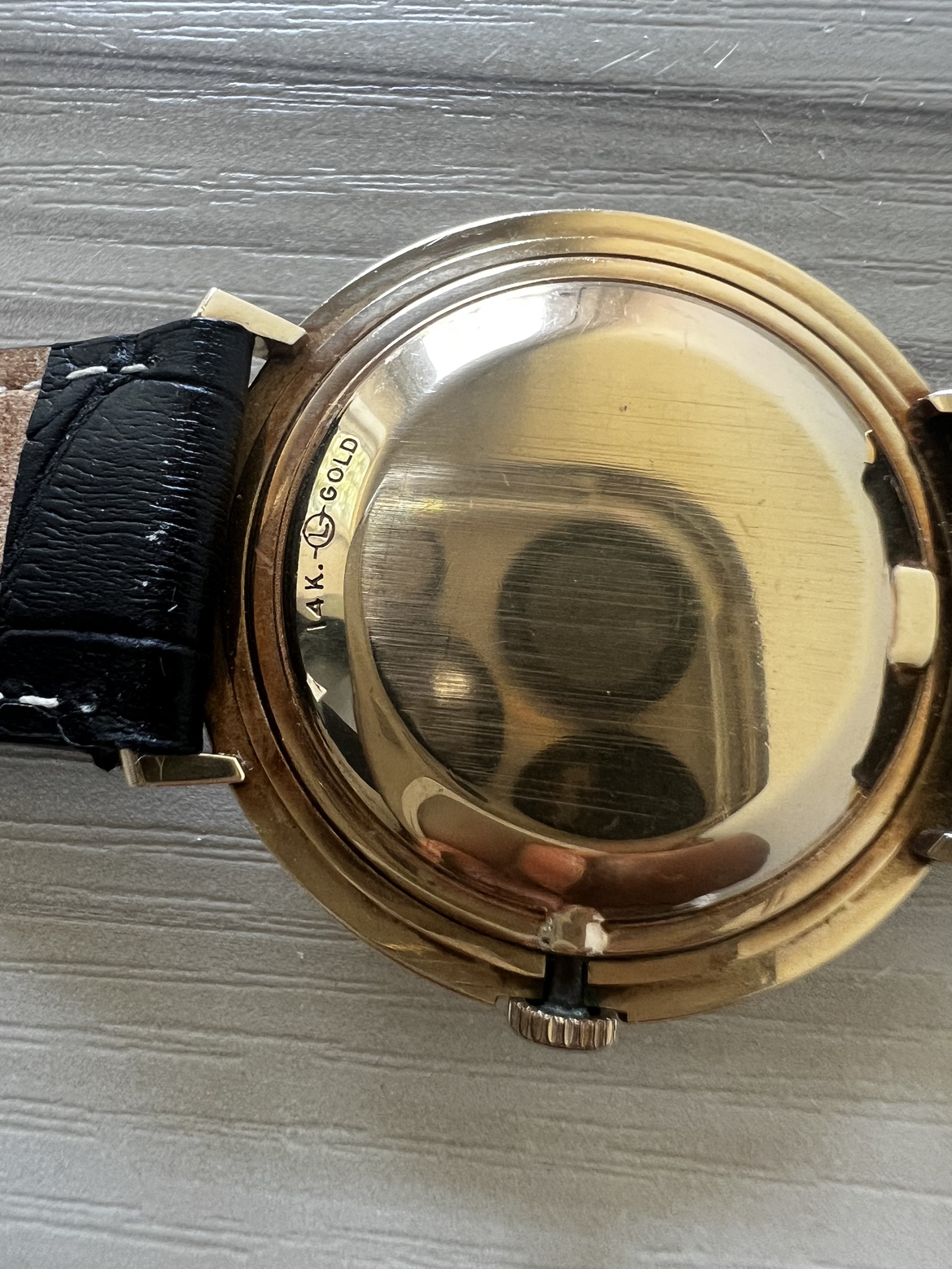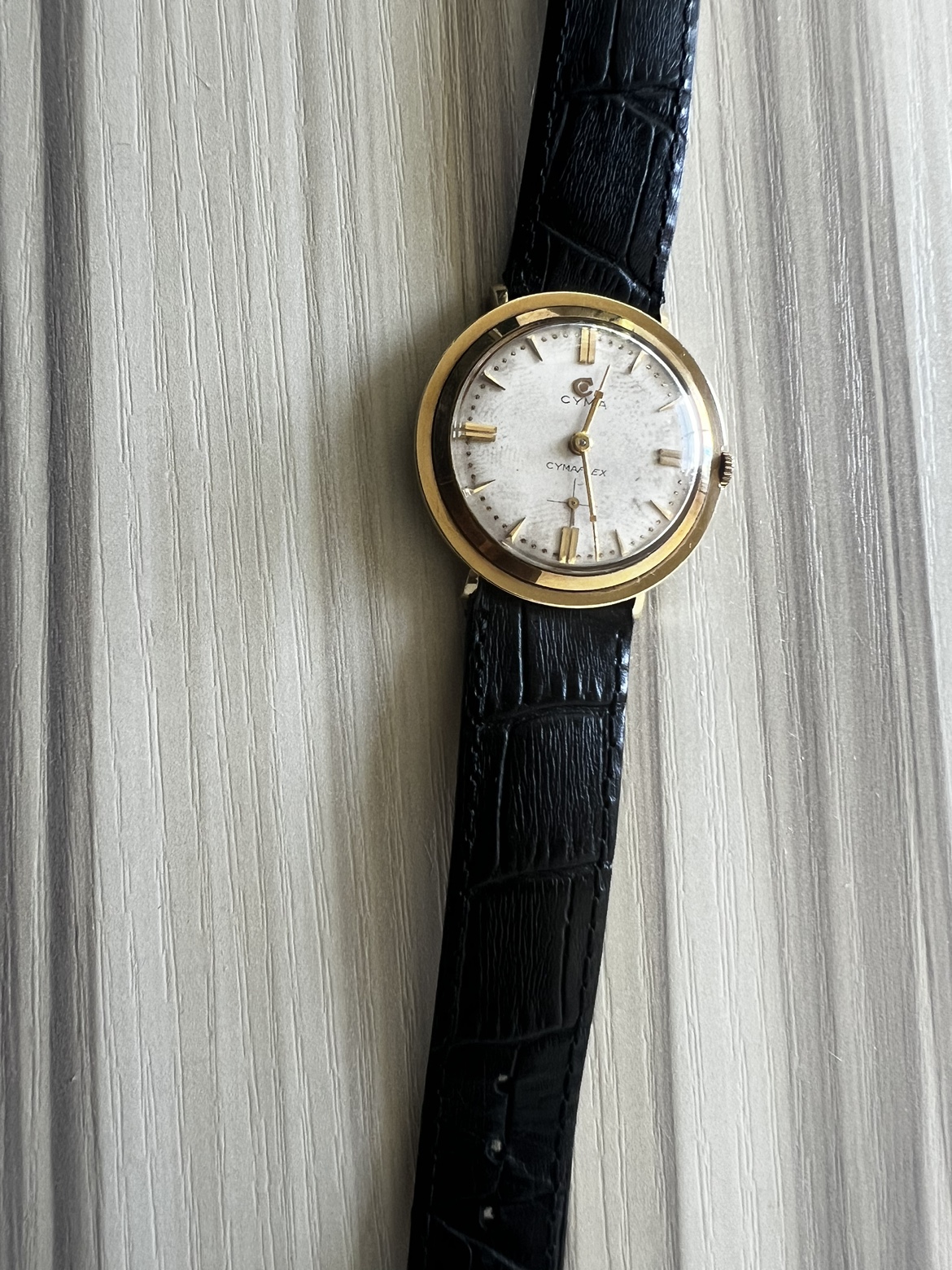 Buy & SellVintage CYMA 14K Gold WatchVintage CYMA 14K Gold Watch$1,000Vintage CYMA 14K Gold watch with a black leather strap. The watch is in working order.ConditionGoodWHERE TO MEETCheck LocationView MapSELLERMarathonWindfields353 reviews1 chats·0 favorites·33 views