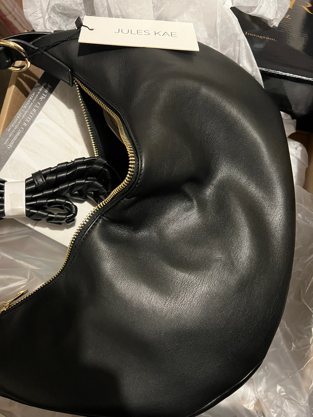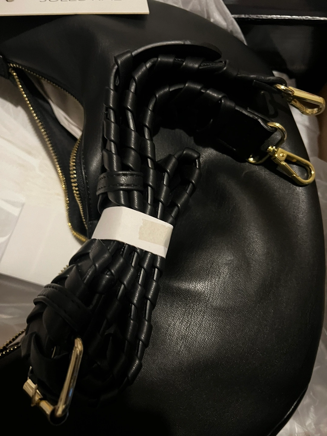 Black vegan leather bag with gold hardware. The bag has a braided strap and a zip closure. The bag is in excellent condition.