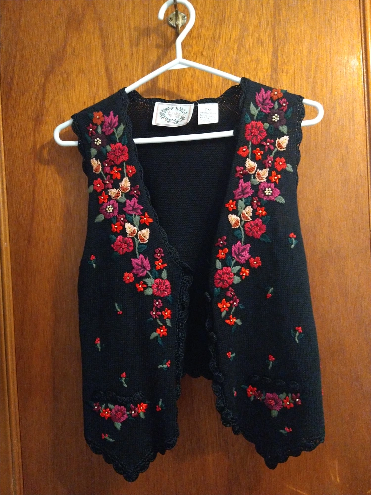 Beautiful black knitted vest with floral embroidery and beaded accents. White blouse is not included, it is for the vest to stand out.