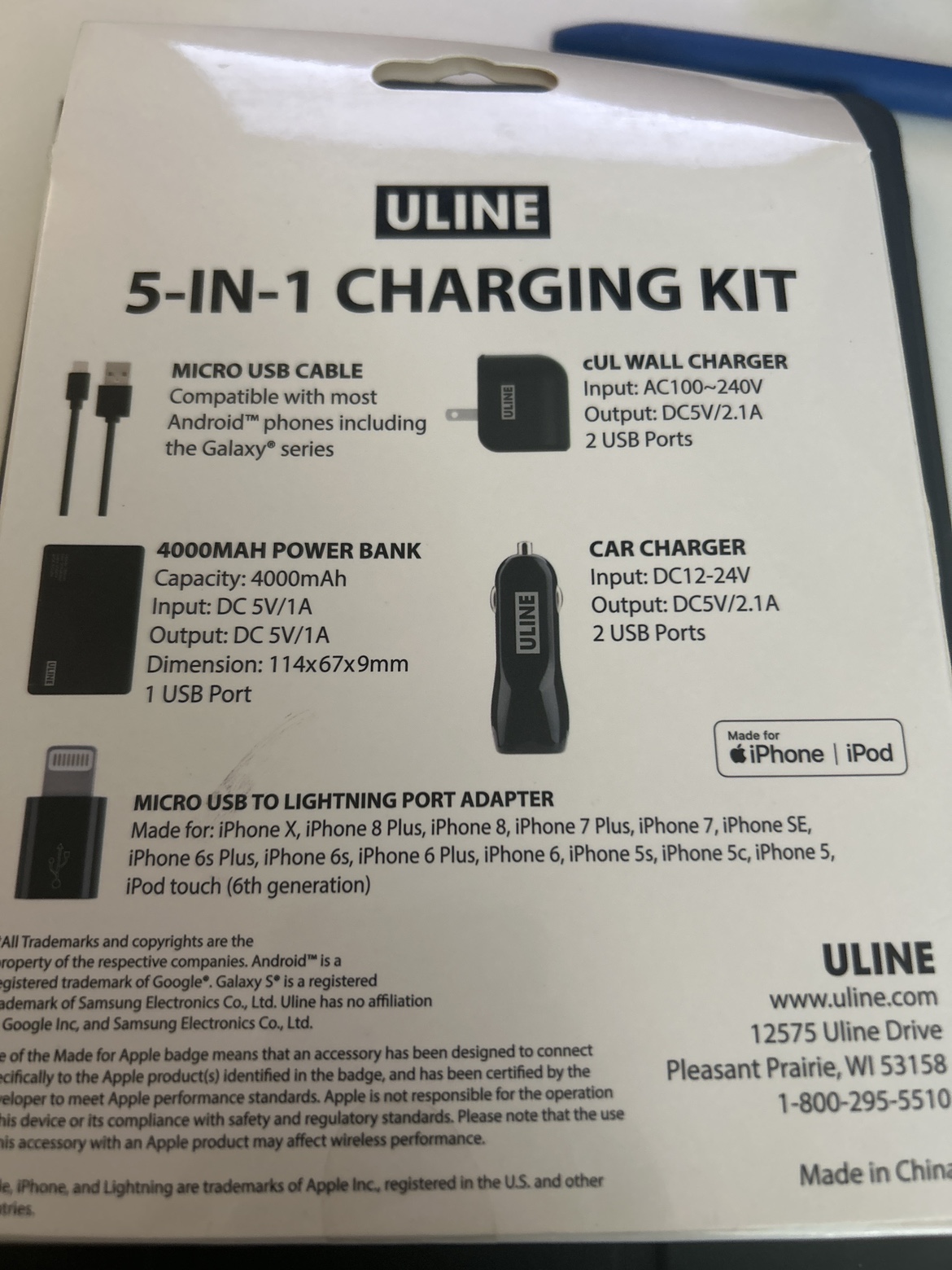 A 5-in-1 charging kit that includes a dual USB car charger, a dual USB wall charger, a 4000mAh power bank, a Micro USB to Lightning port adapter and wireless accessories.