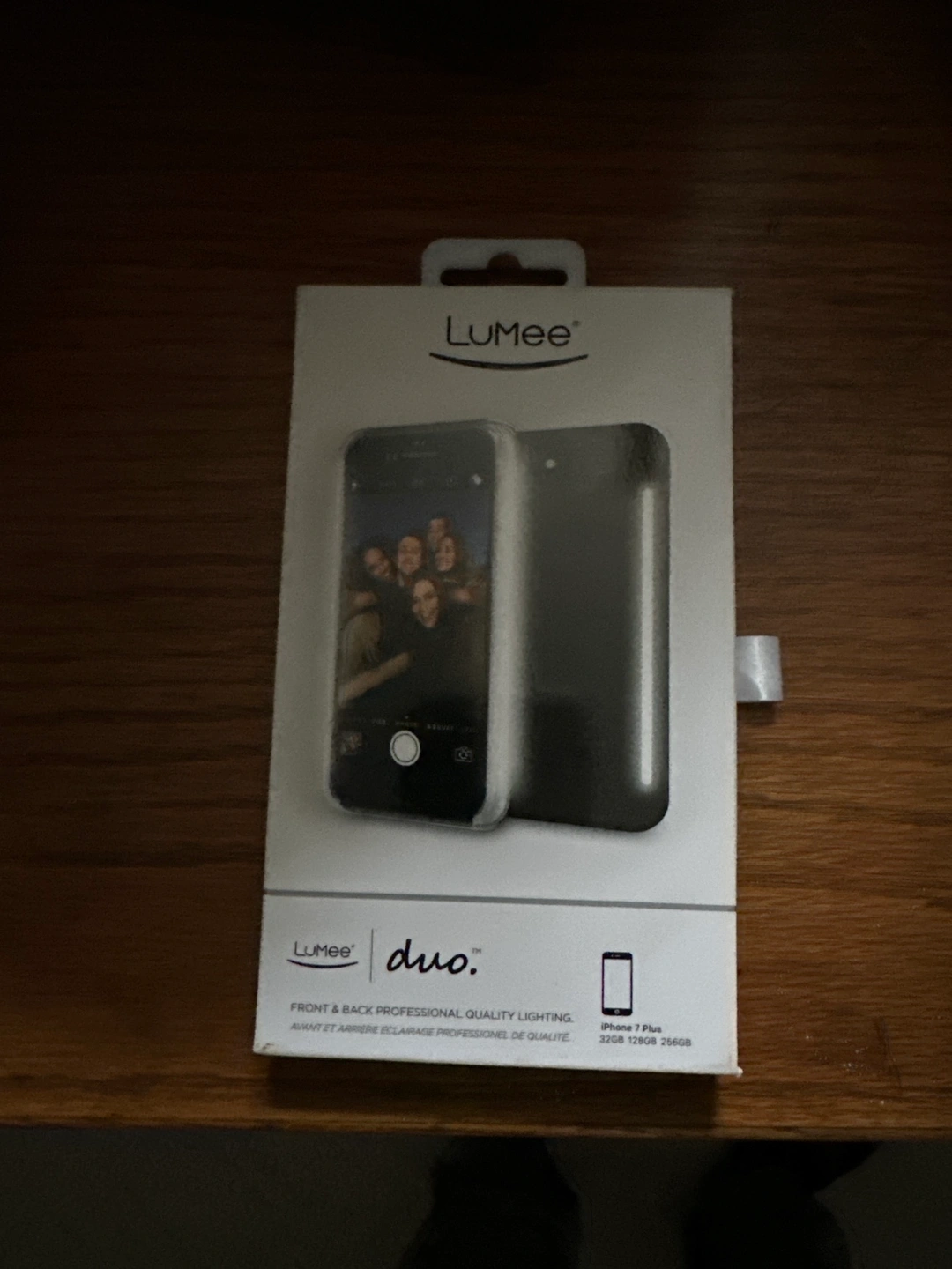 A black Lumee Duo phone case with built-in lighting. The case has a light on both the front and back. The case is designed for an iPhone 7 Plus. Slightly scratched on the back