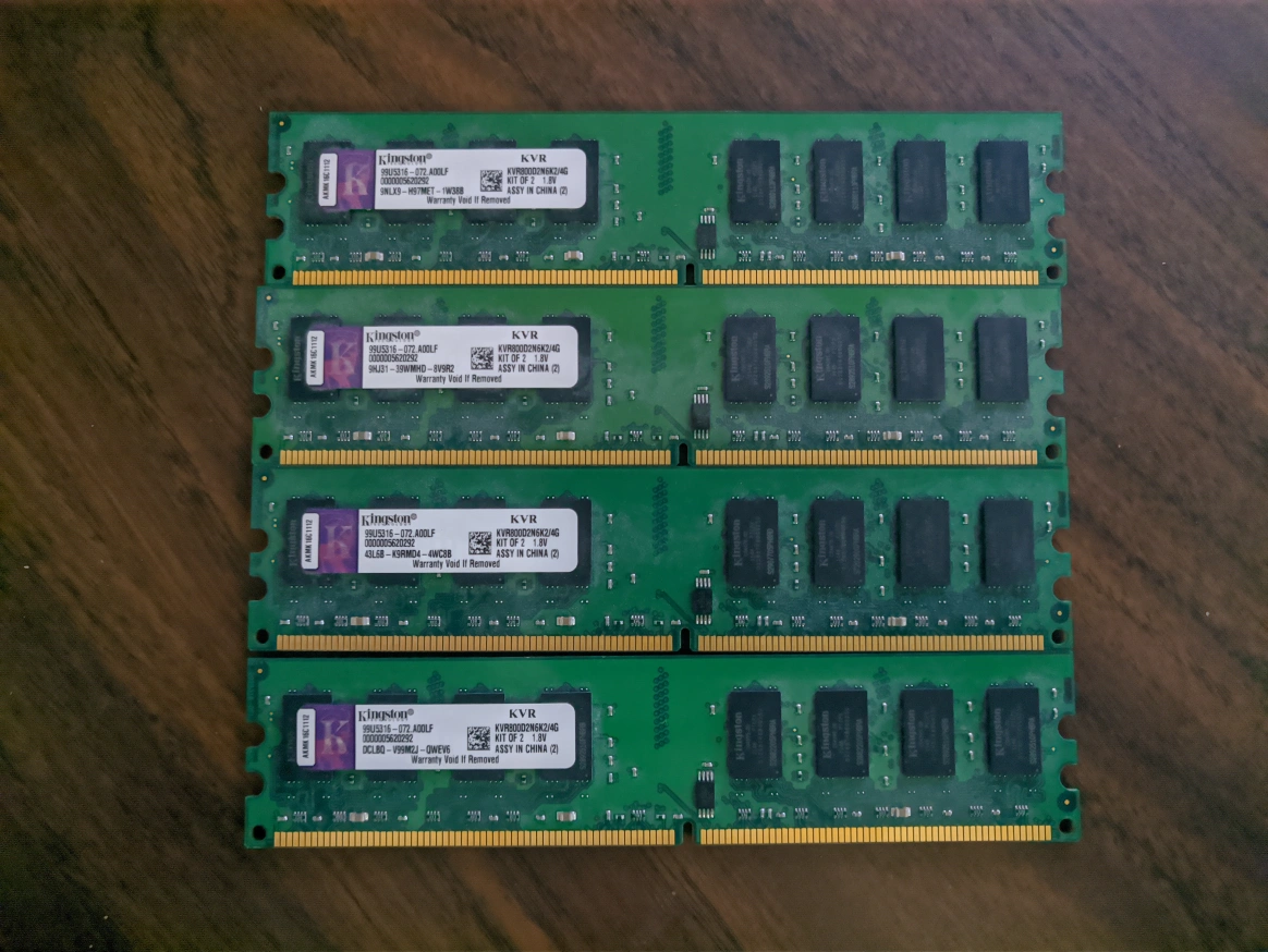3054 Kingston KVR800D2N6K2 DDR2 800MHz RAM sticks. Priced to sell. Total Ram = 4x2gb =8gb