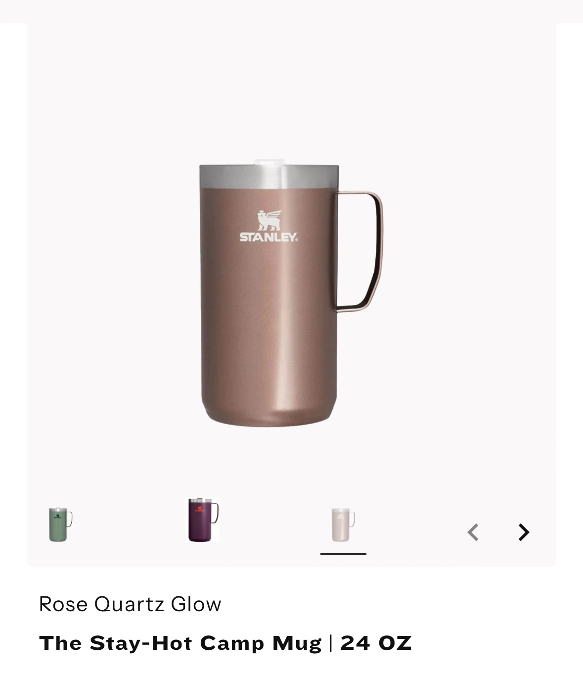 Rose Quartz Glow coloured Stanley 24 oz Camp Mug. Features a double-wall, vacuum-insulated design for keeping your drinks hot or cold for hours. Includes a lid. Has a comfortable, easy-grip handle. Perfect for camping, hiking, or everyday use.