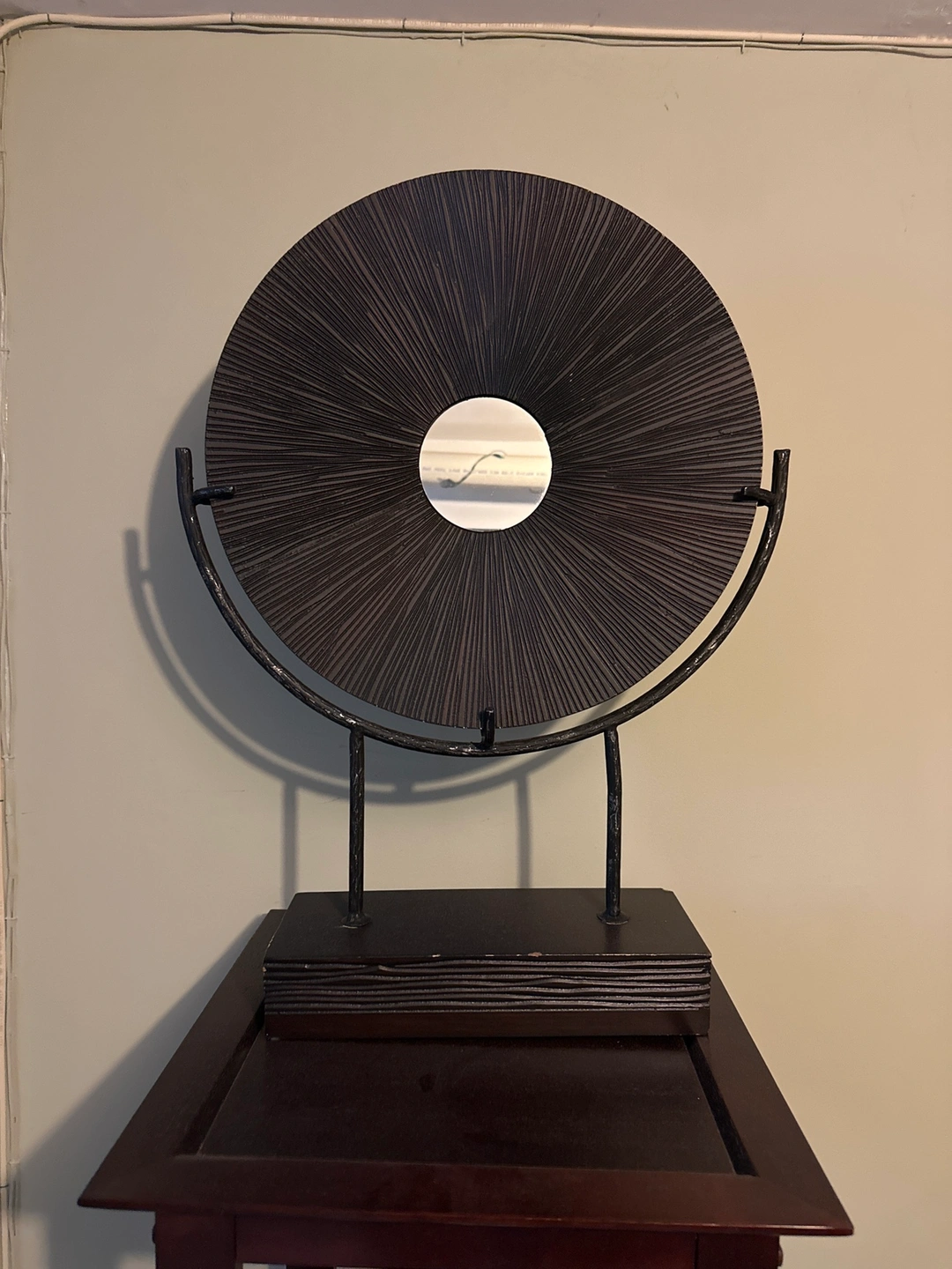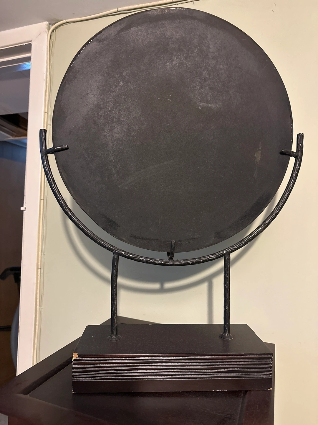 Black and brown decorative wall hanging with a metal stand and a round wooden piece with a design carved into it.