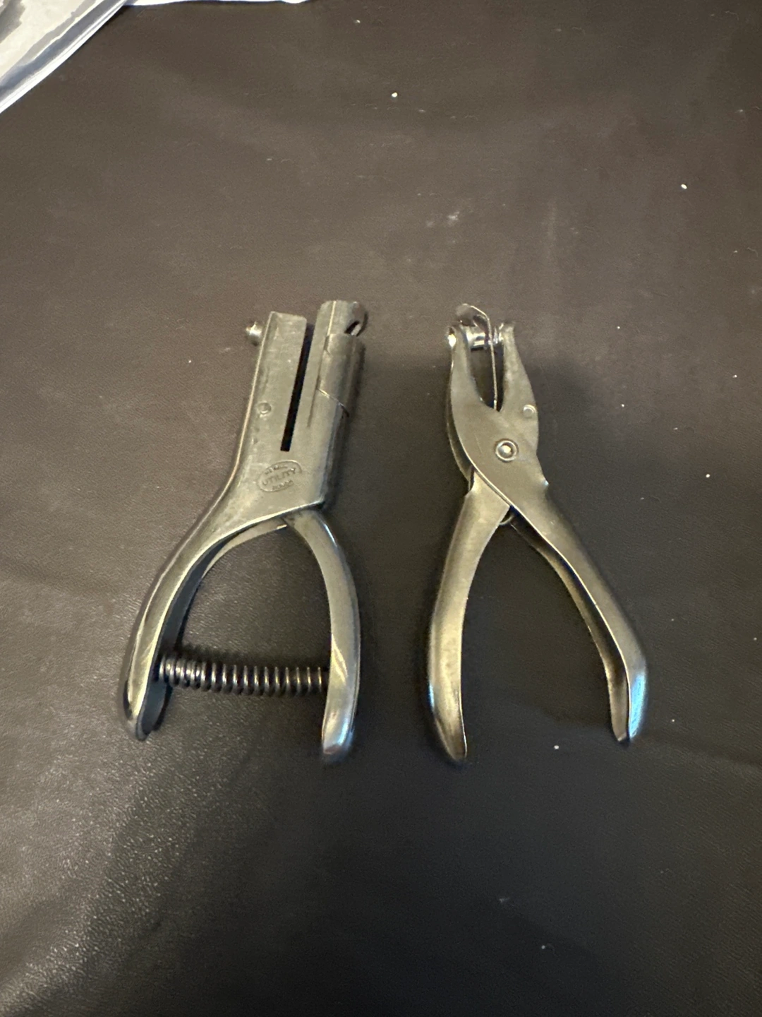 Two vintage hole punchers. One with a spring loaded lever and the other with a more traditional design. Good condition. Would be a good addition to any vintage collection.