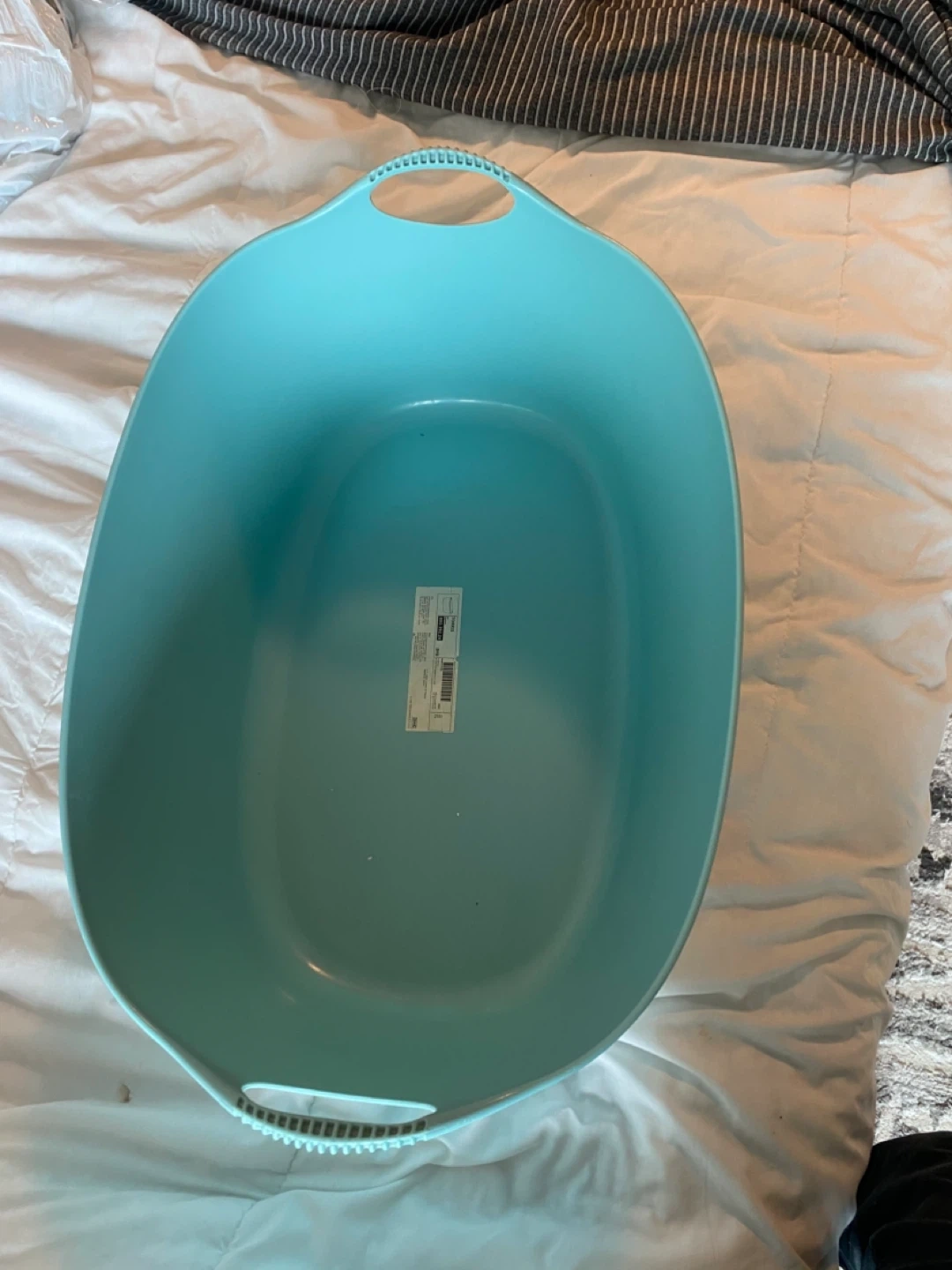 This is an aqua-coloured laundry basket with sturdy handles. It's made of durable plastic. It's perfect for carrying laundry loads.