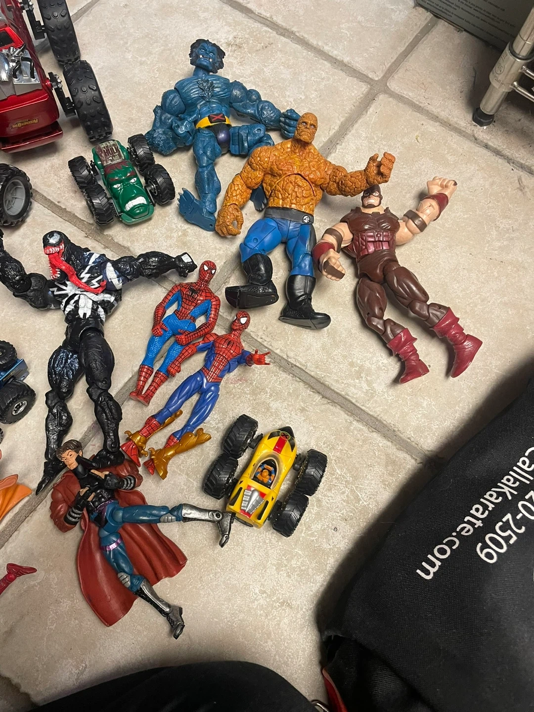 Selling a mixed lot of Marvel action figures and toy cars. There are a variety of characters including Spider-Man, Hulk, Venom, and others. Great for any Marvel fan or collector!