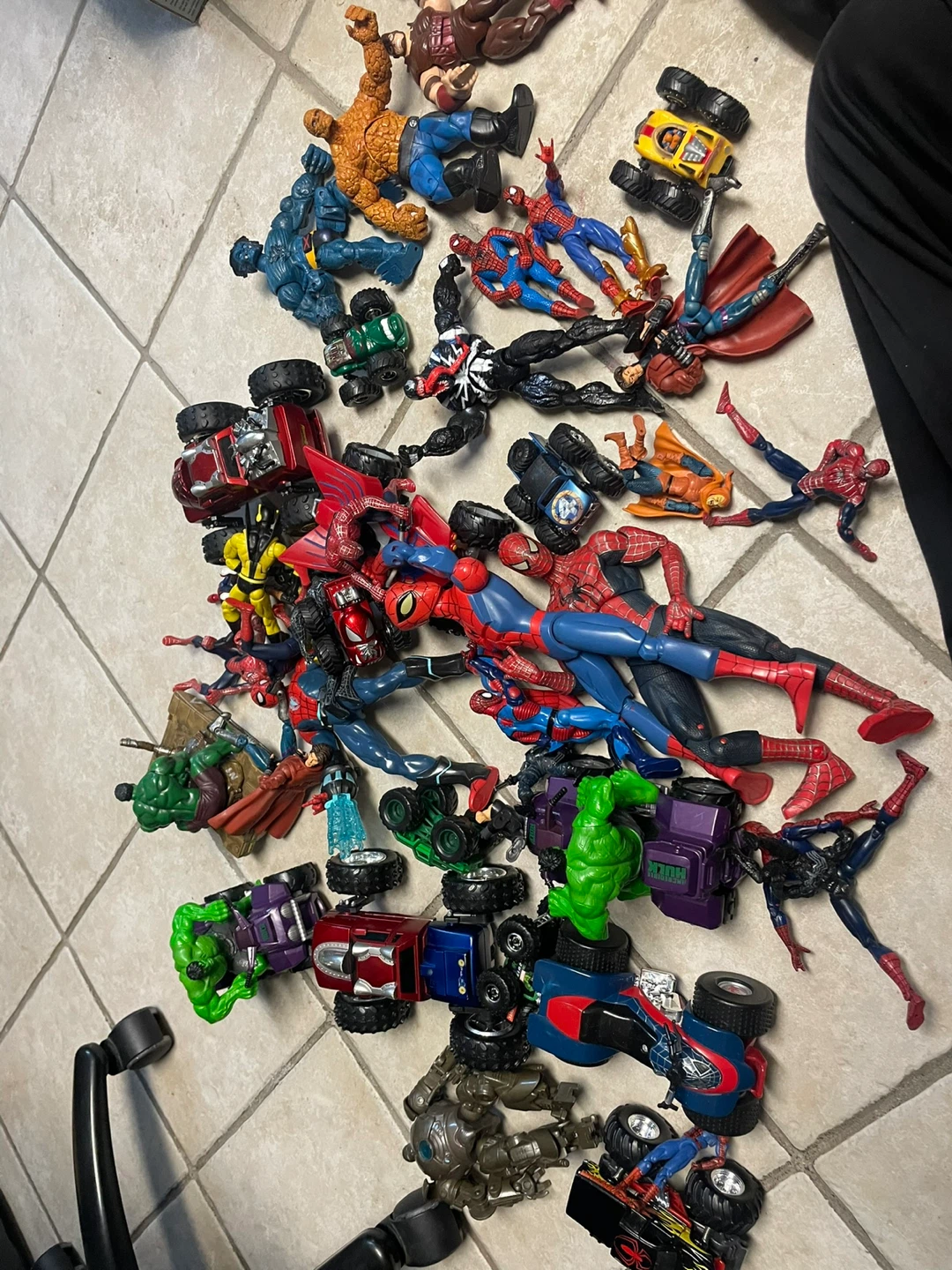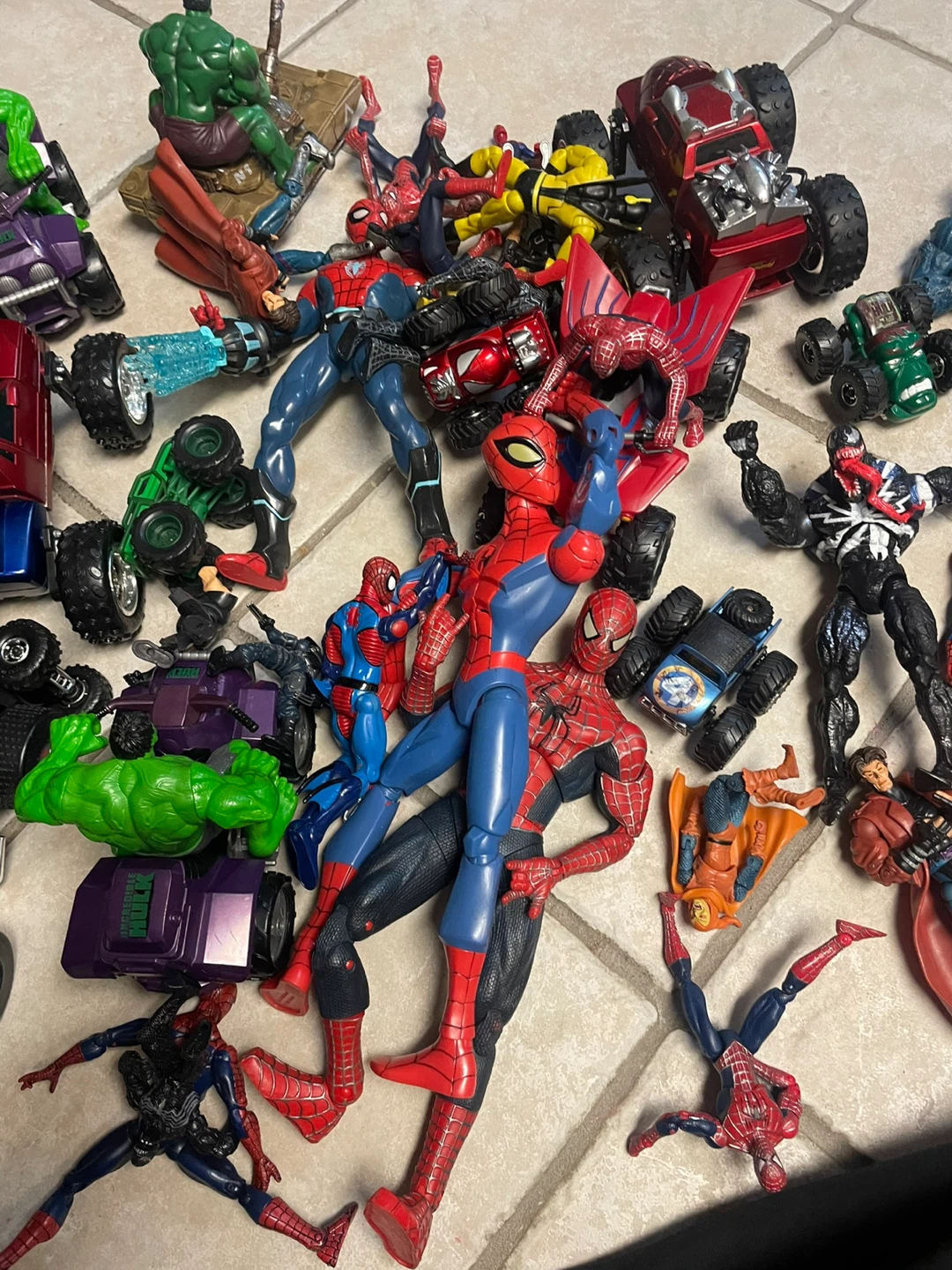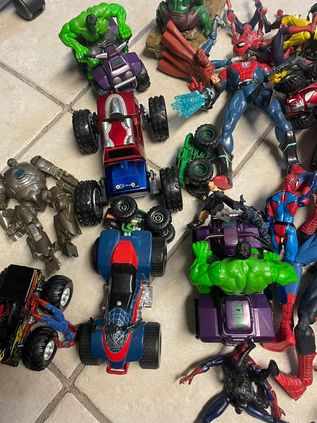 Selling a mixed lot of Marvel action figures and toy cars. There are a variety of characters including Spider-Man, Hulk, Venom, and others. Great for any Marvel fan or collector!