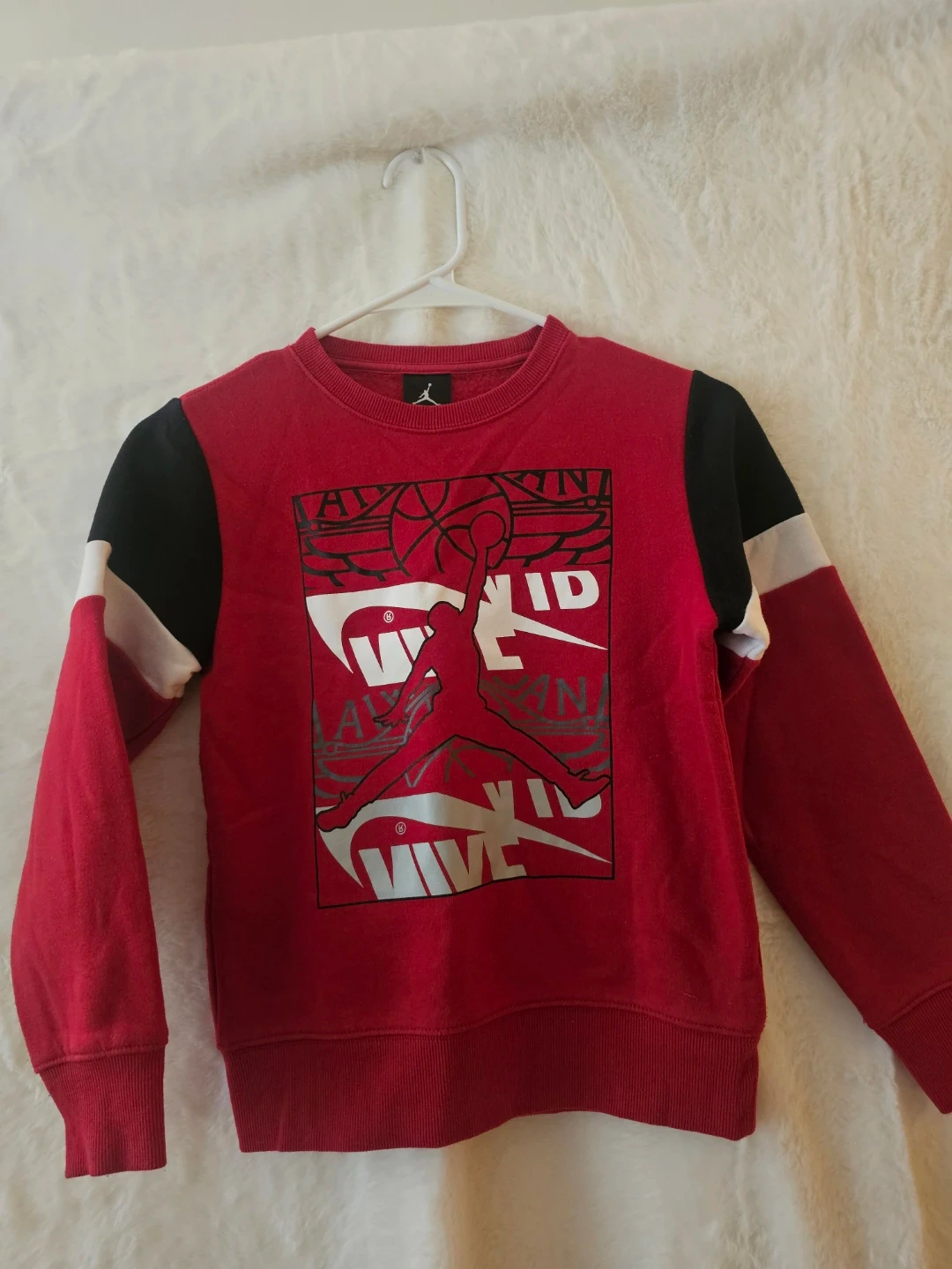 Selling a Jordan kids' sweatshirt in red! It features black and white stripes on the sleeves and the iconic Jordan logo on the front. Perfect for a young basketball fan
