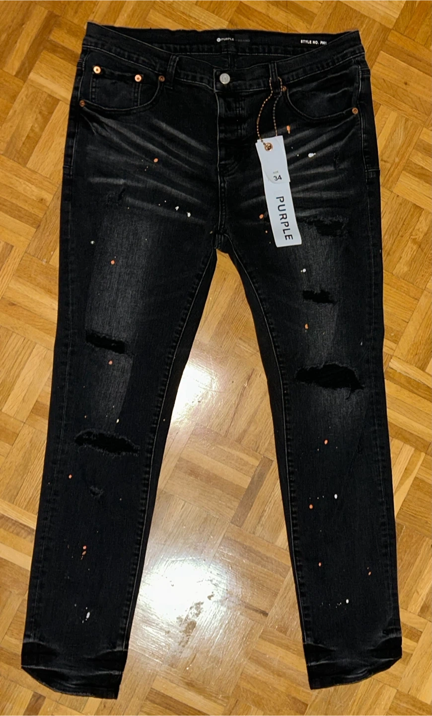 Purple Brand black denim jeans with paint splatter details. These jeans are a size 34. They feature distressed accents and a unique paint-splattered design.