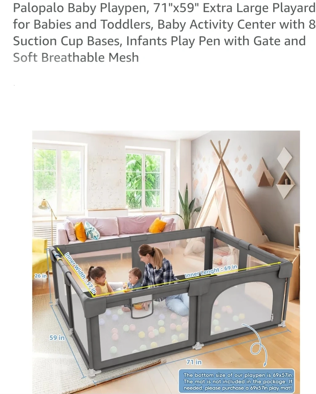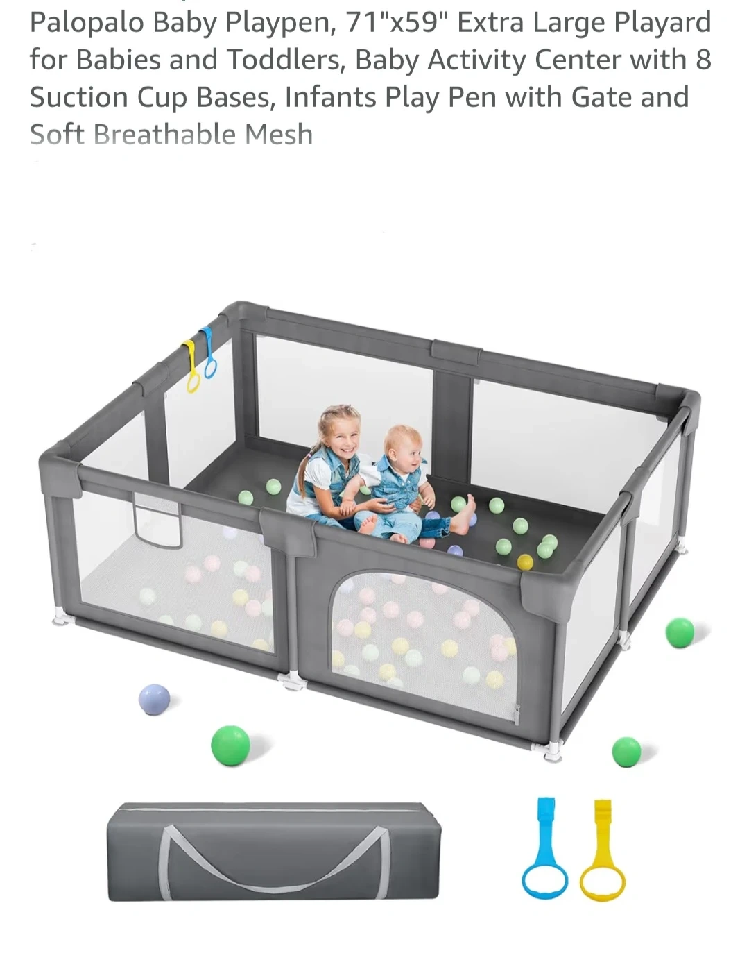 This Palapalo baby playpen is 71 inches by 59 inches, providing extra-large space for babies and toddlers. It's made with soft, breathable mesh and includes a gate for easy access. The playpen comes with hanging toys for added fun and a convenient carrying bag.