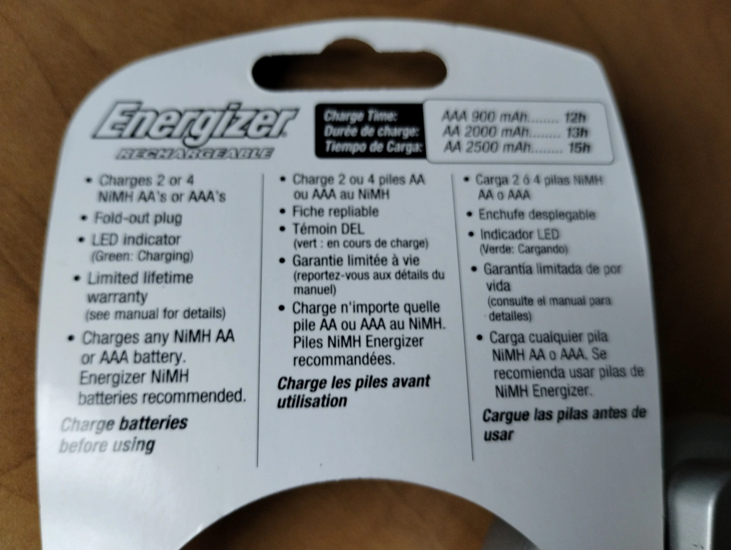 Four-slot charger for AA or AAA batteries. Fold-out plug. LED indicator light. Limited lifetime warranty. Charges Energizer or NiMH batteries. Charge time varies depending on battery type.