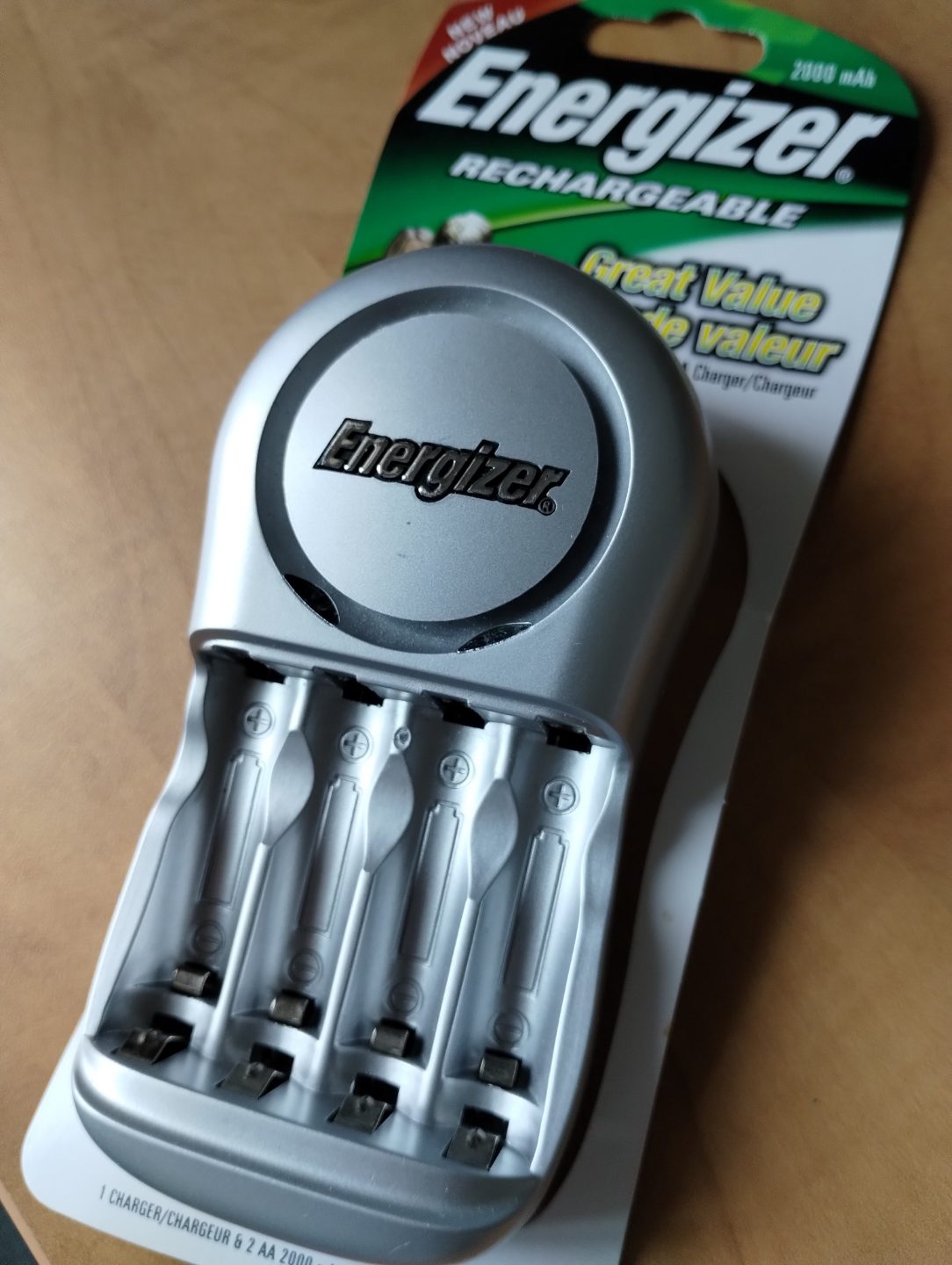 Four-slot charger for AA or AAA batteries. Fold-out plug. LED indicator light. Limited lifetime warranty. Charges Energizer or NiMH batteries. Charge time varies depending on battery type.