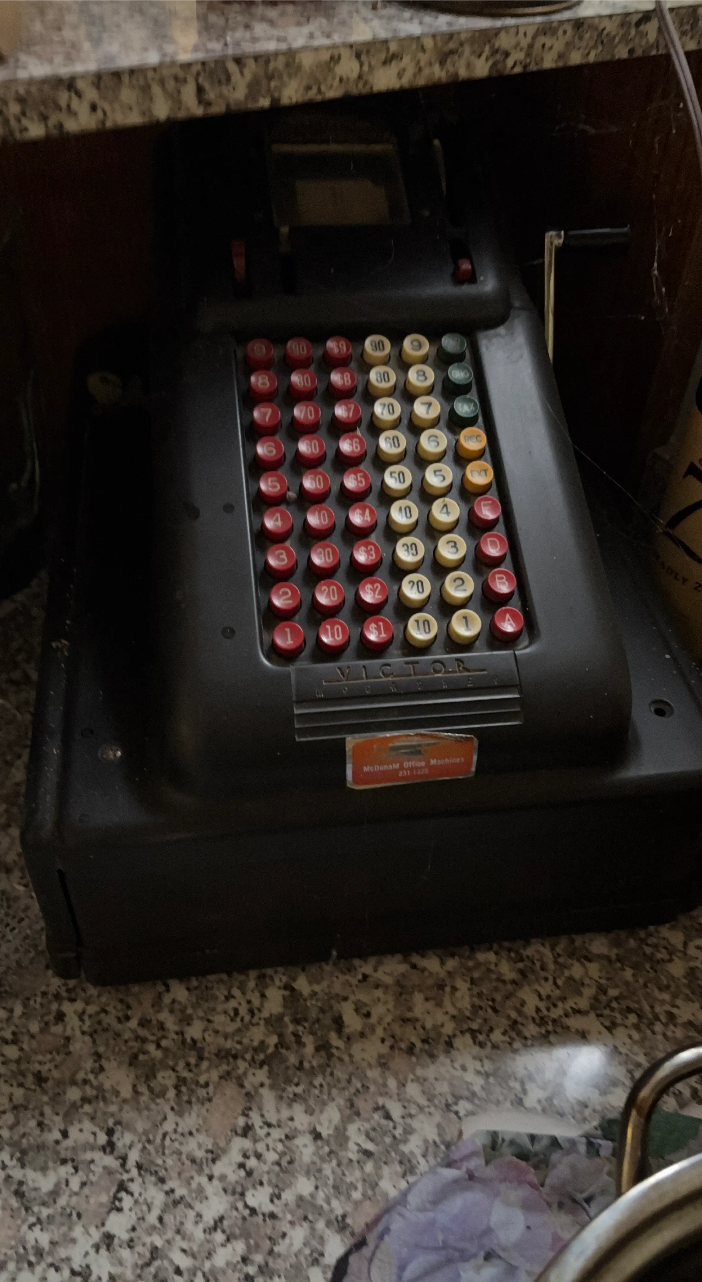 This is a vintage Victor cash register with a manual crank. It features a full keyboard for entering amounts and various function keys. A sticker from McDonald Office Machines is present.