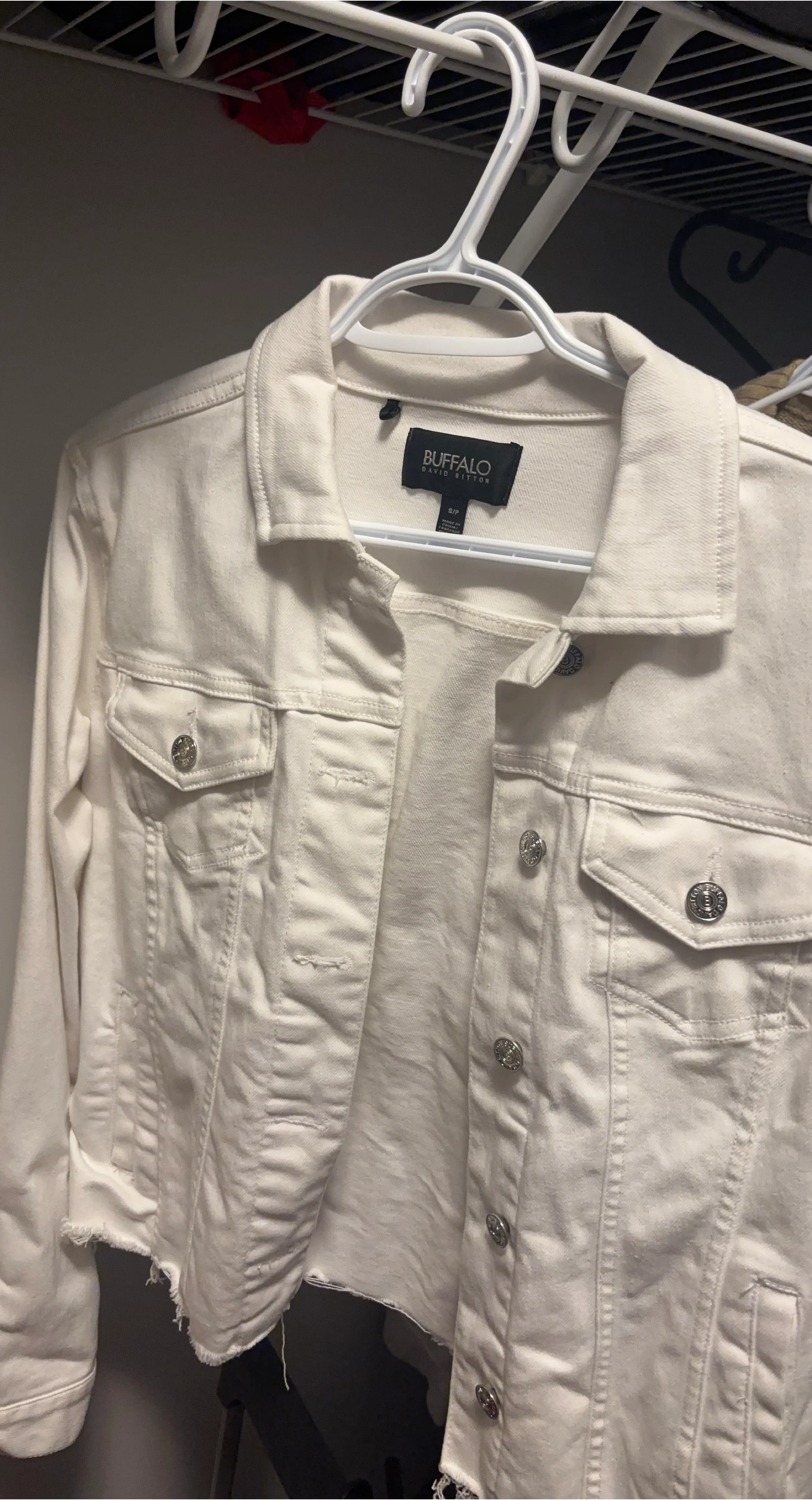 Buffalo David Bitton white denim jacket. Features button closure and chest pockets. Size is S/P. Made in Cambodia.