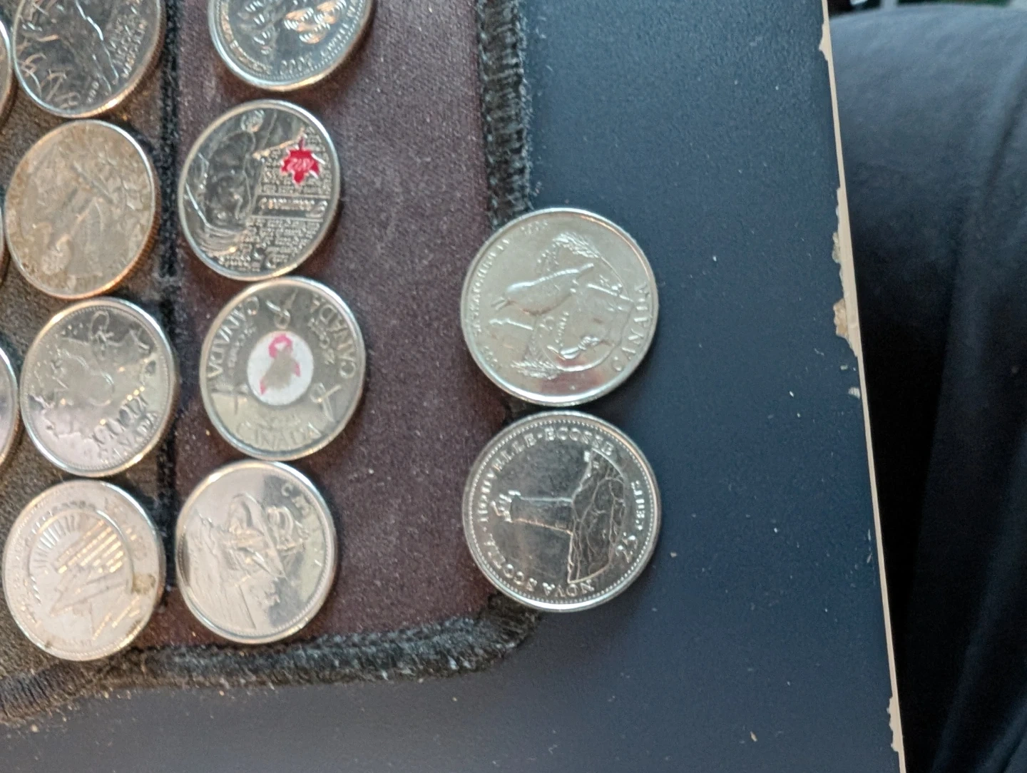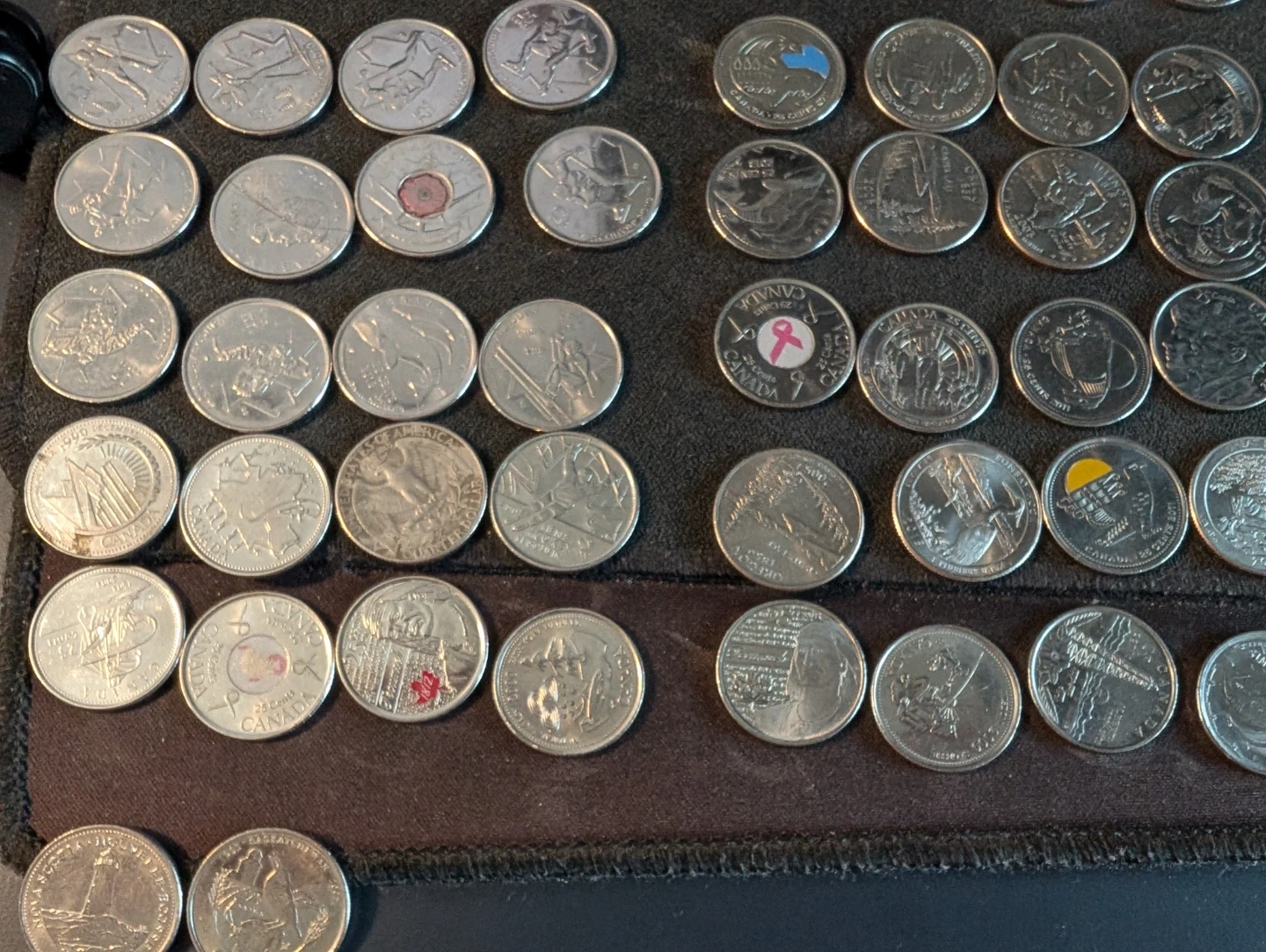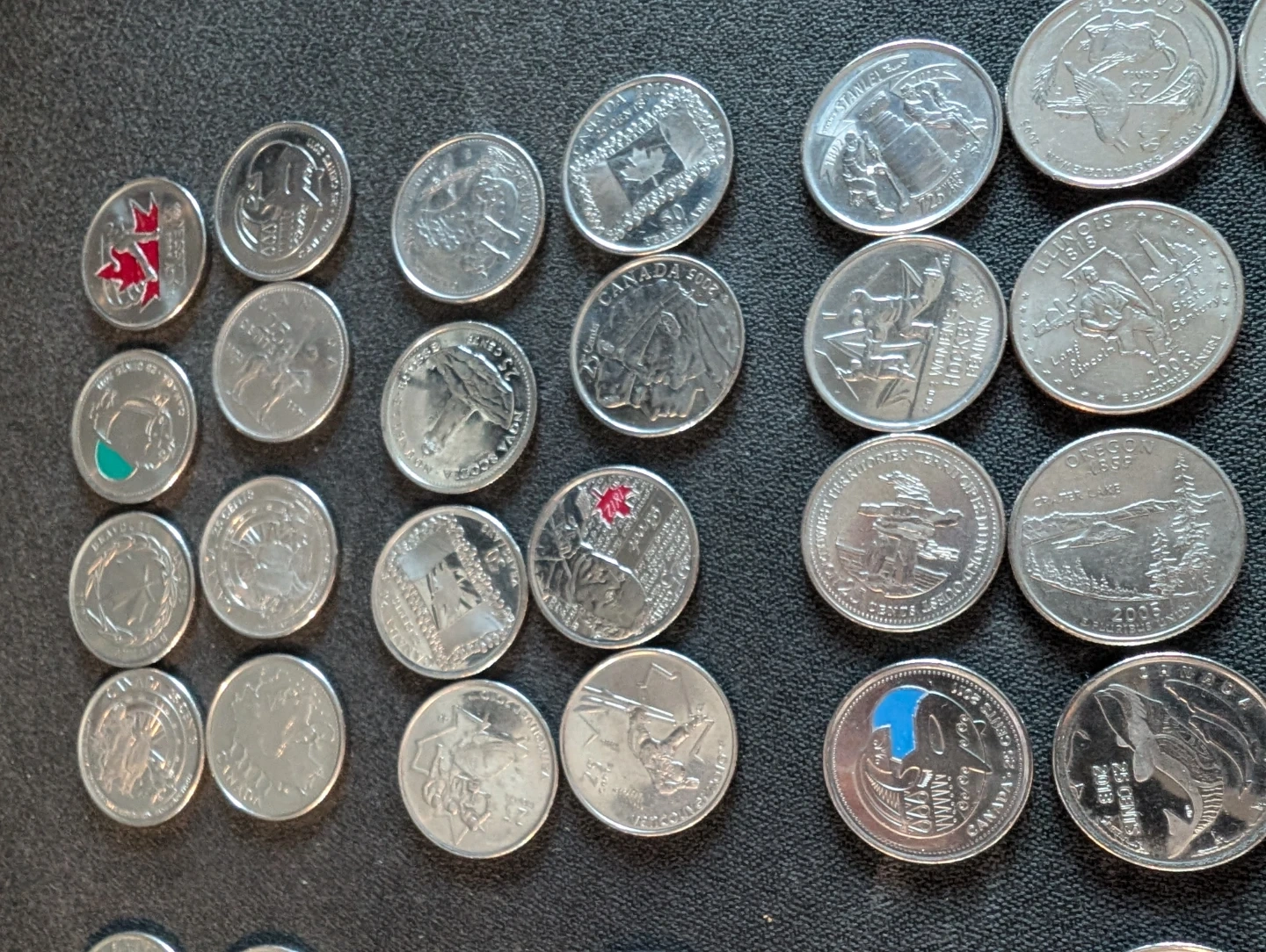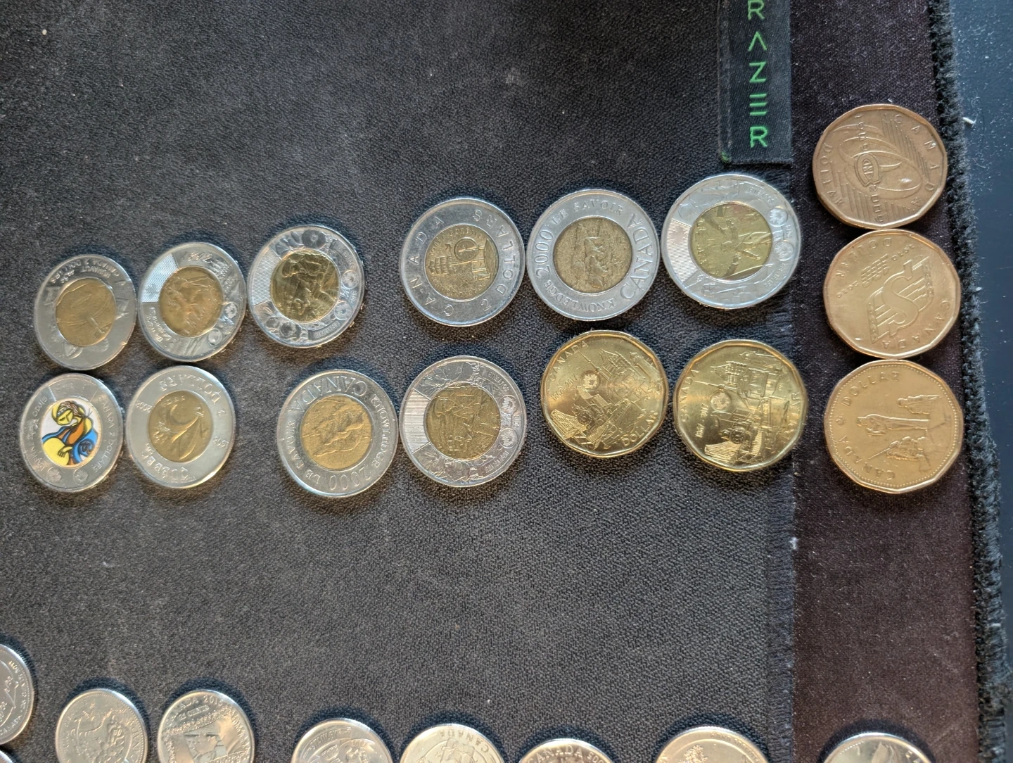 This is a collection of various Canadian coins. It includes toonies, loonies, and other denominations. Some coins feature special designs and commemorative images. These coins are great for collectors or anyone interested in Canadian currency.