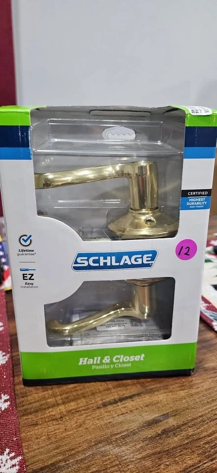 Schlage Hall & Closet door lever set in satin brass finish.