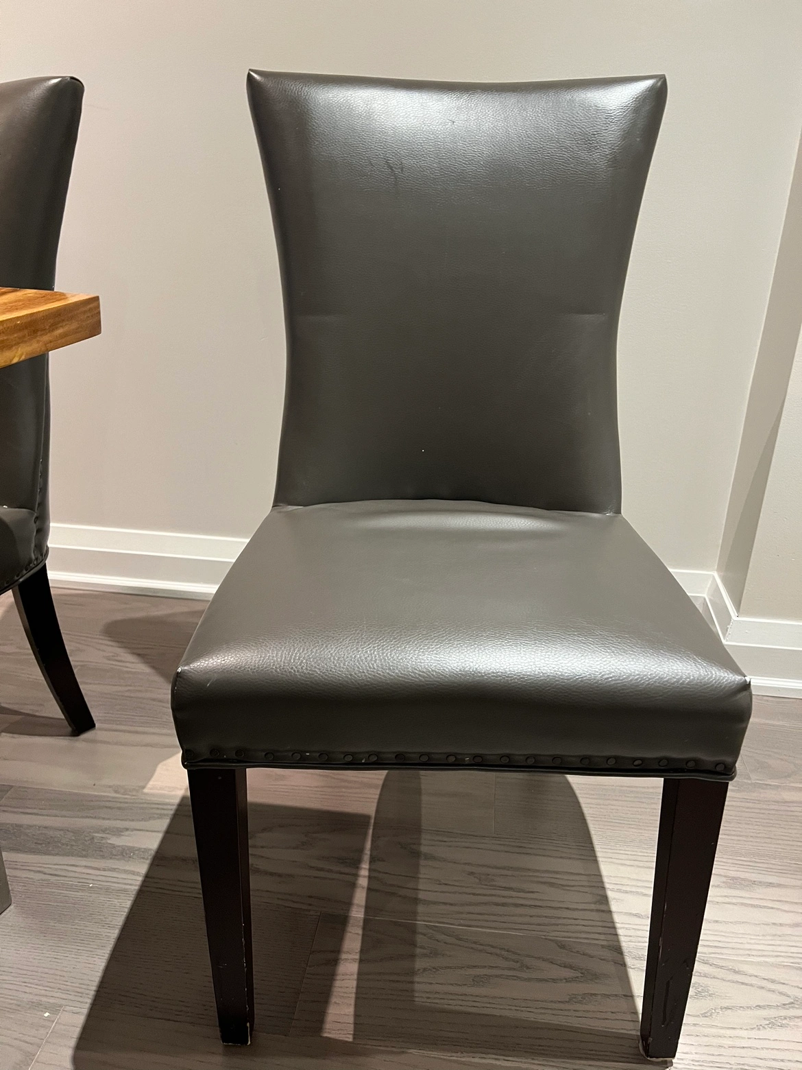 Artemano solid wood table, bench and faux leather chairs. Table is perfect for the dining room or kitchen. It is walnut colour with a smooth surface and metal legs.