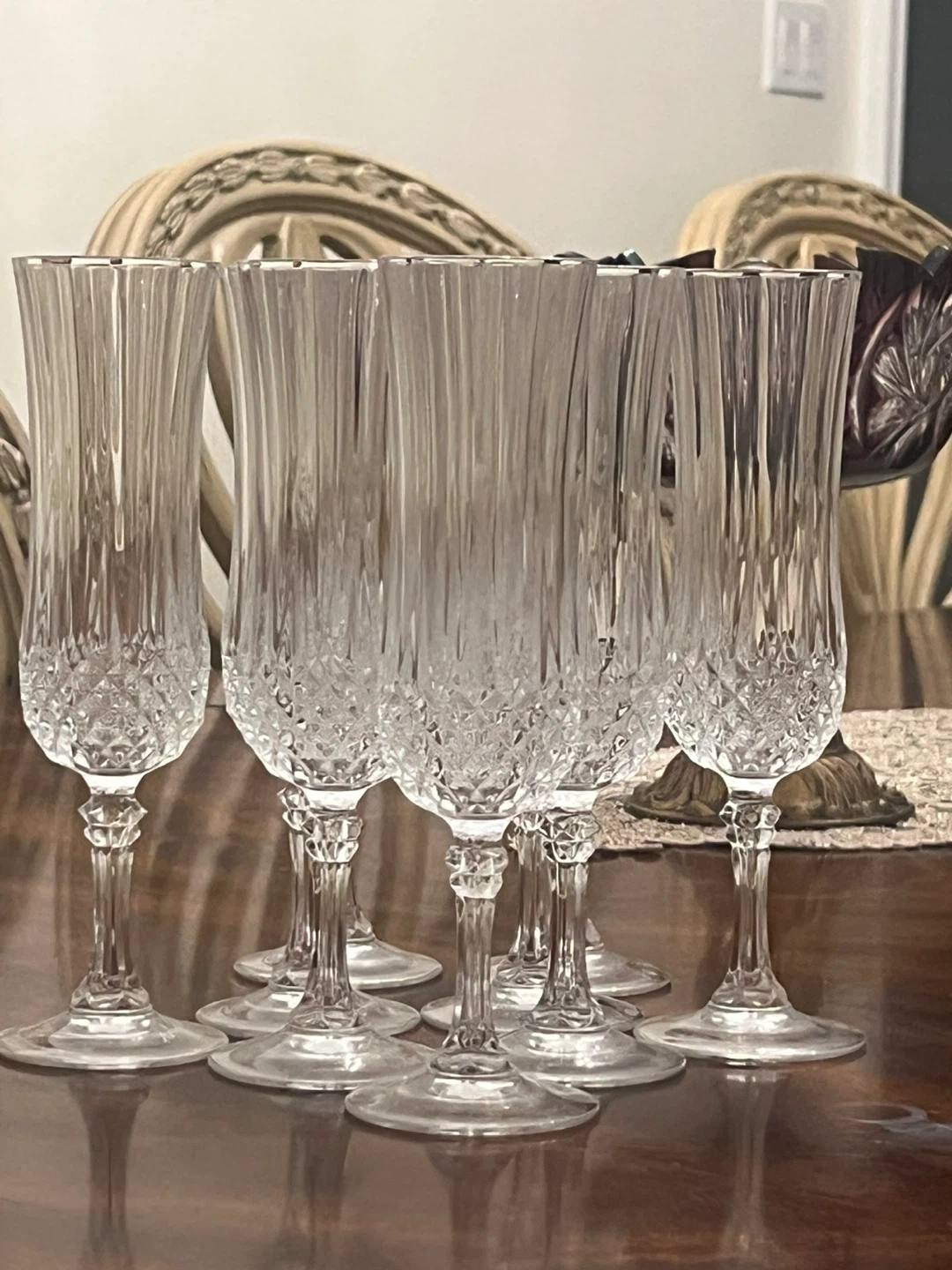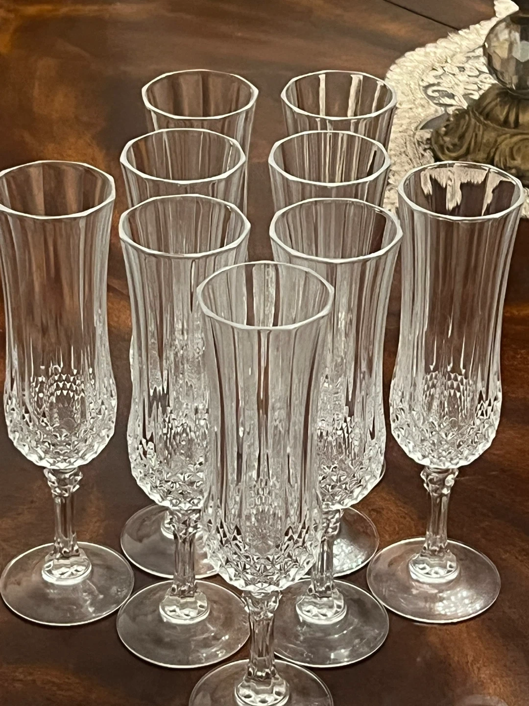 Elegant set of eight fluted champagne glasses, perfect for special occasions. Each glass features a clear crystal construction with a detailed diamond-cut pattern around the base of the bowl and vertical fluting on the upper portion. They have a slender stem and a round base. These glasses will add a touch of sparkle to any celebration!
