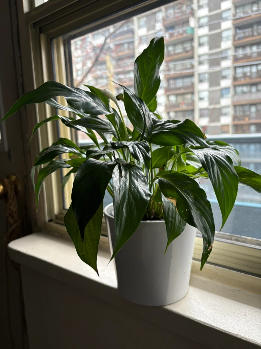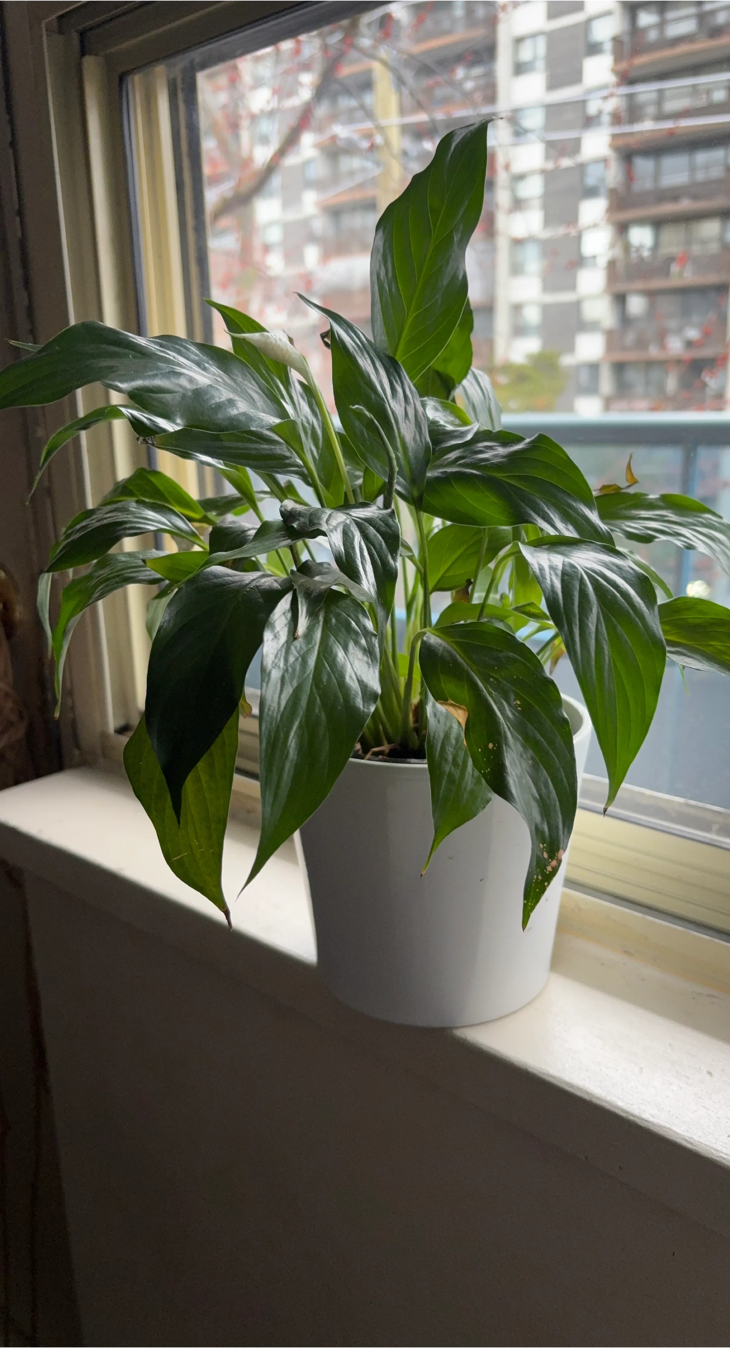 A healthy peace lily plant with lush green foliage is housed in a simple white pot. This plant thrives in low light conditions and is known for its air-purifying qualities. It's a popular choice for indoor spaces.