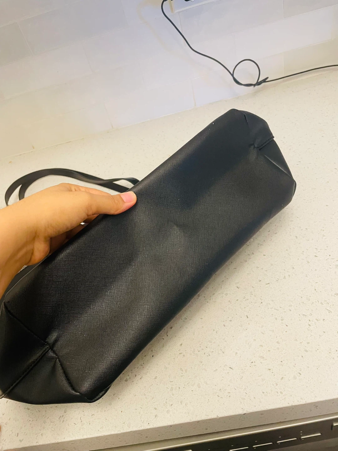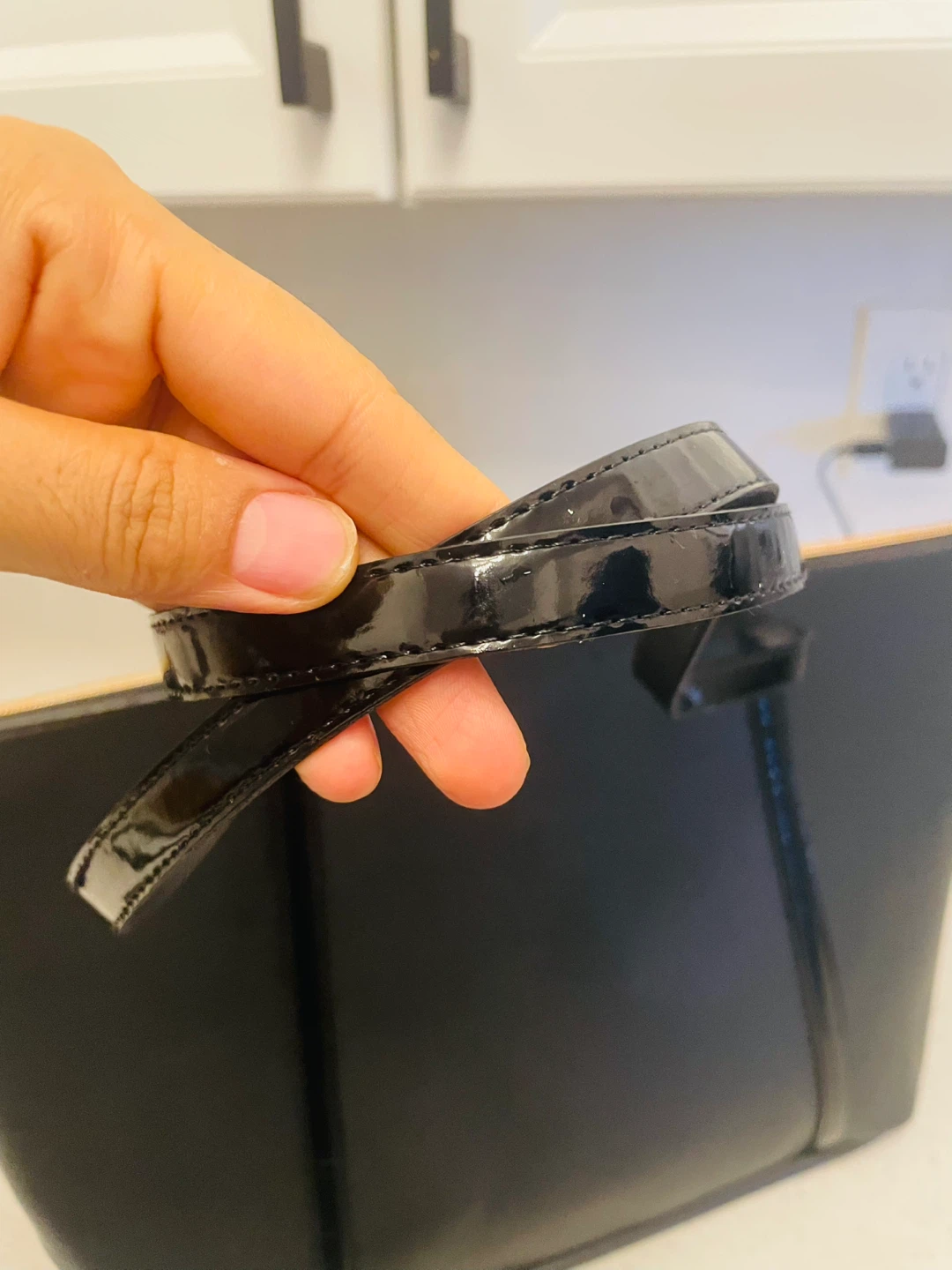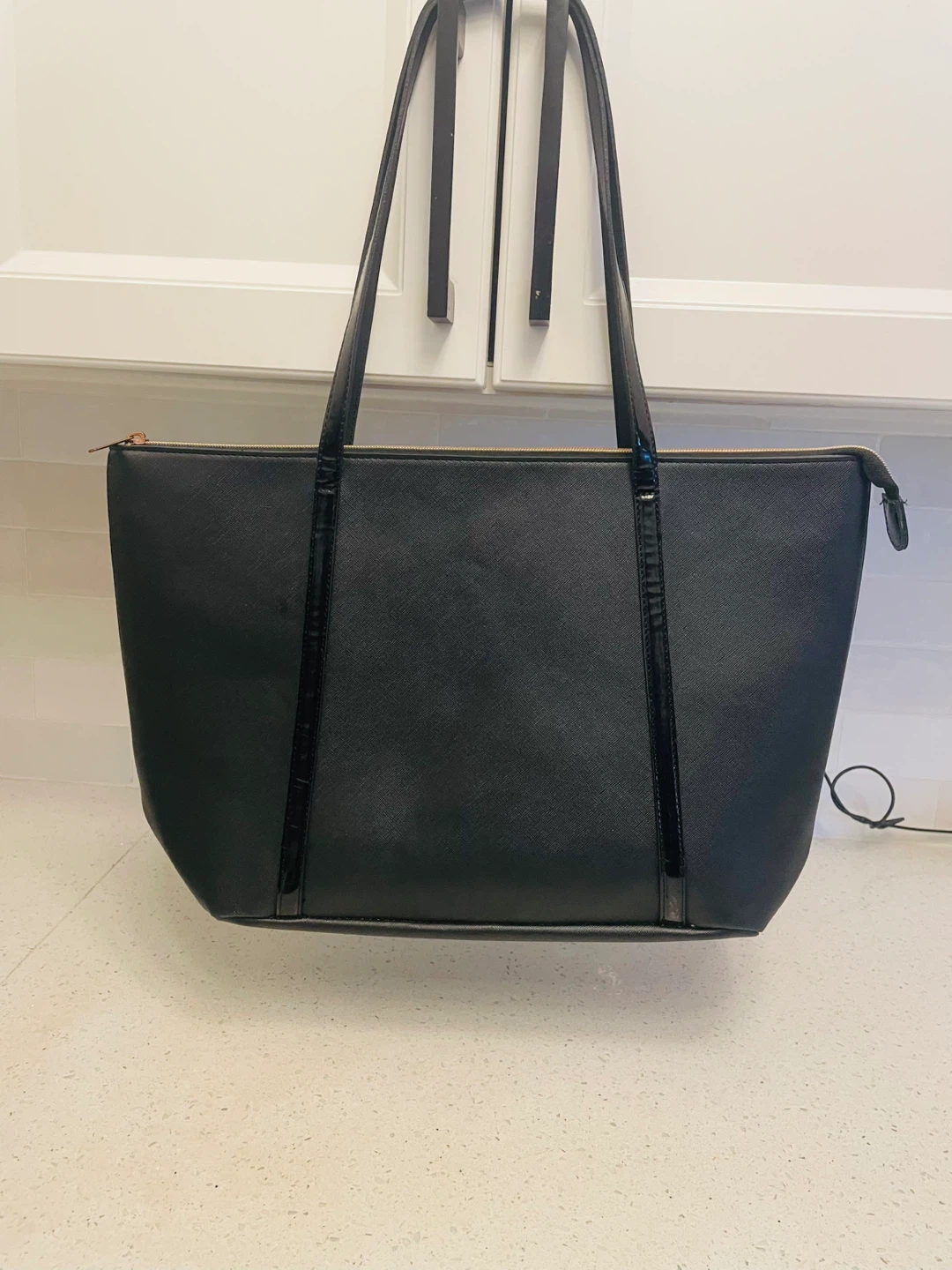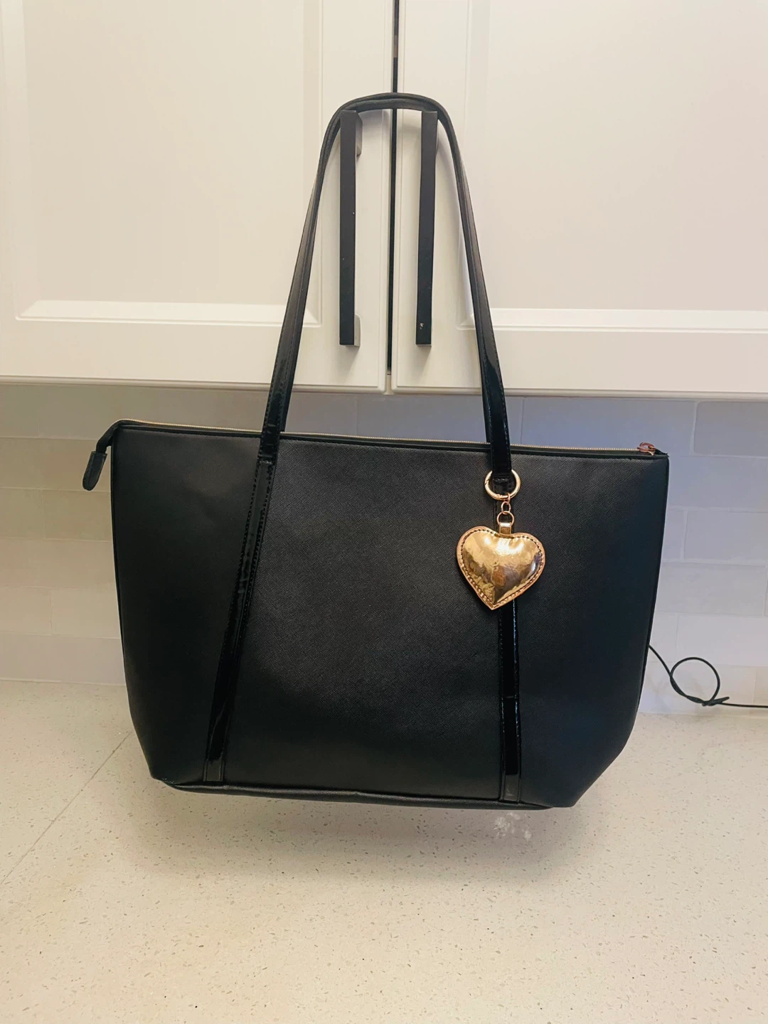 Classic black tote bag featuring shiny patent leather handles and a cute gold heart charm. Zipper closure keeps belongings secure. It's made of faux leather material. Diaper bag luxury