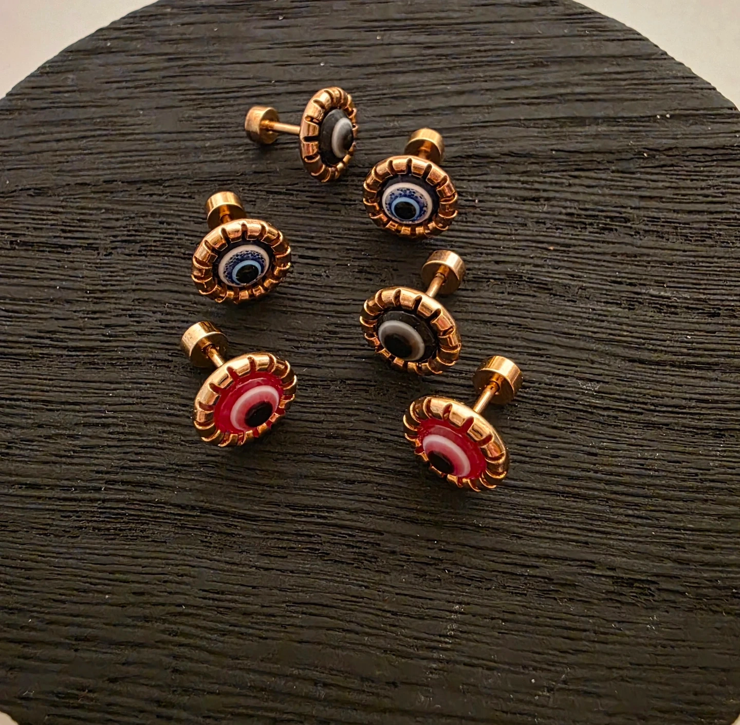 Set of 3 gold-tone stud earrings featuring the evil eye design. Each earring has a unique color variation with blue, white, and red accents. Stainless steel earrings with screw backing.